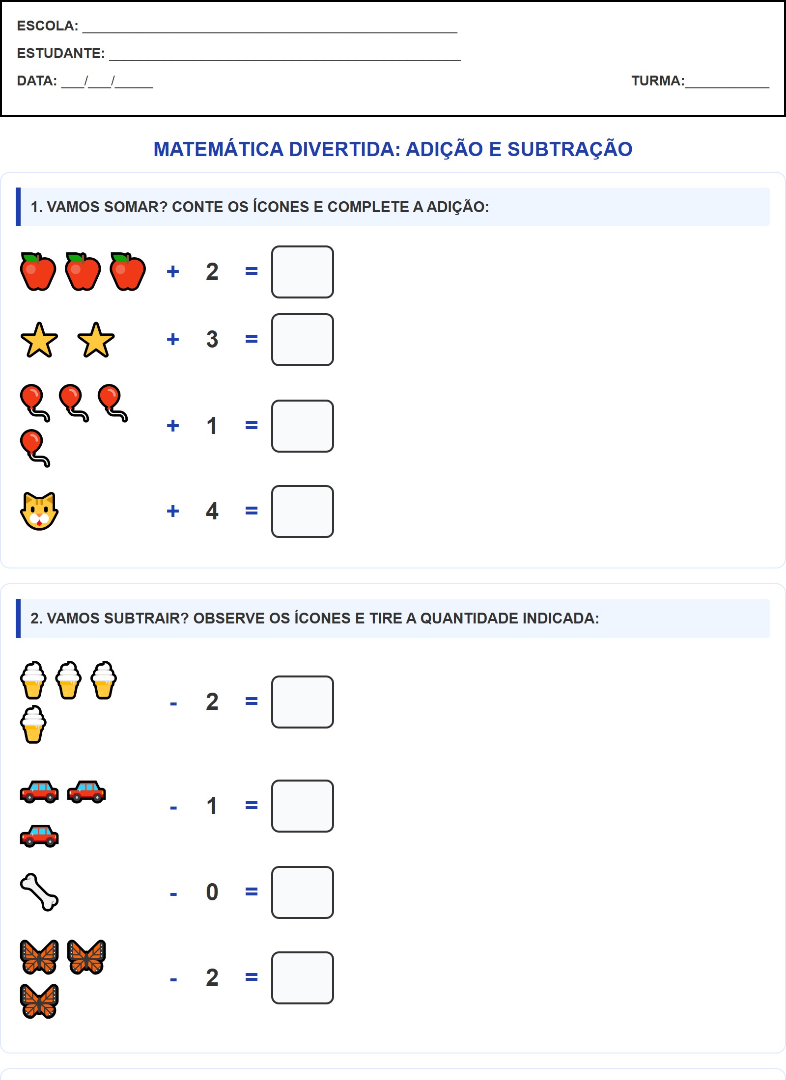 1. VAMOS SOMAR? CONTE OS ÍCONES E COMPLETE A ADIÇÃO: