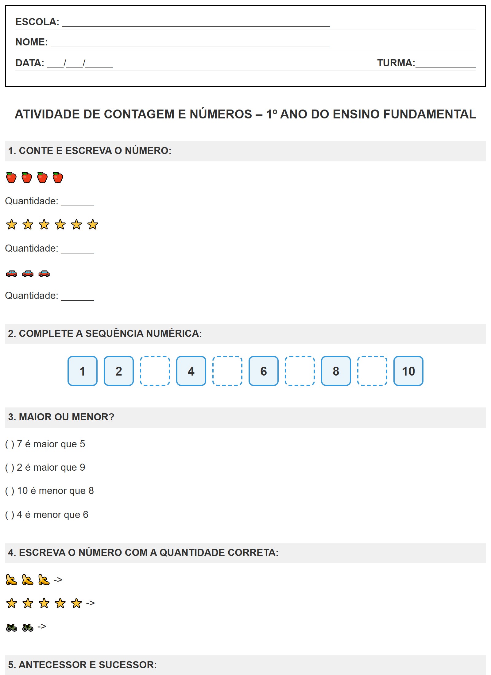 Atividade de Matemática 1º Ano: Complete as Quantidades e... Atividade de Contagem de 1 a 100 – 1º Ano Atividade de Comparacao De Numeros 1º Ano