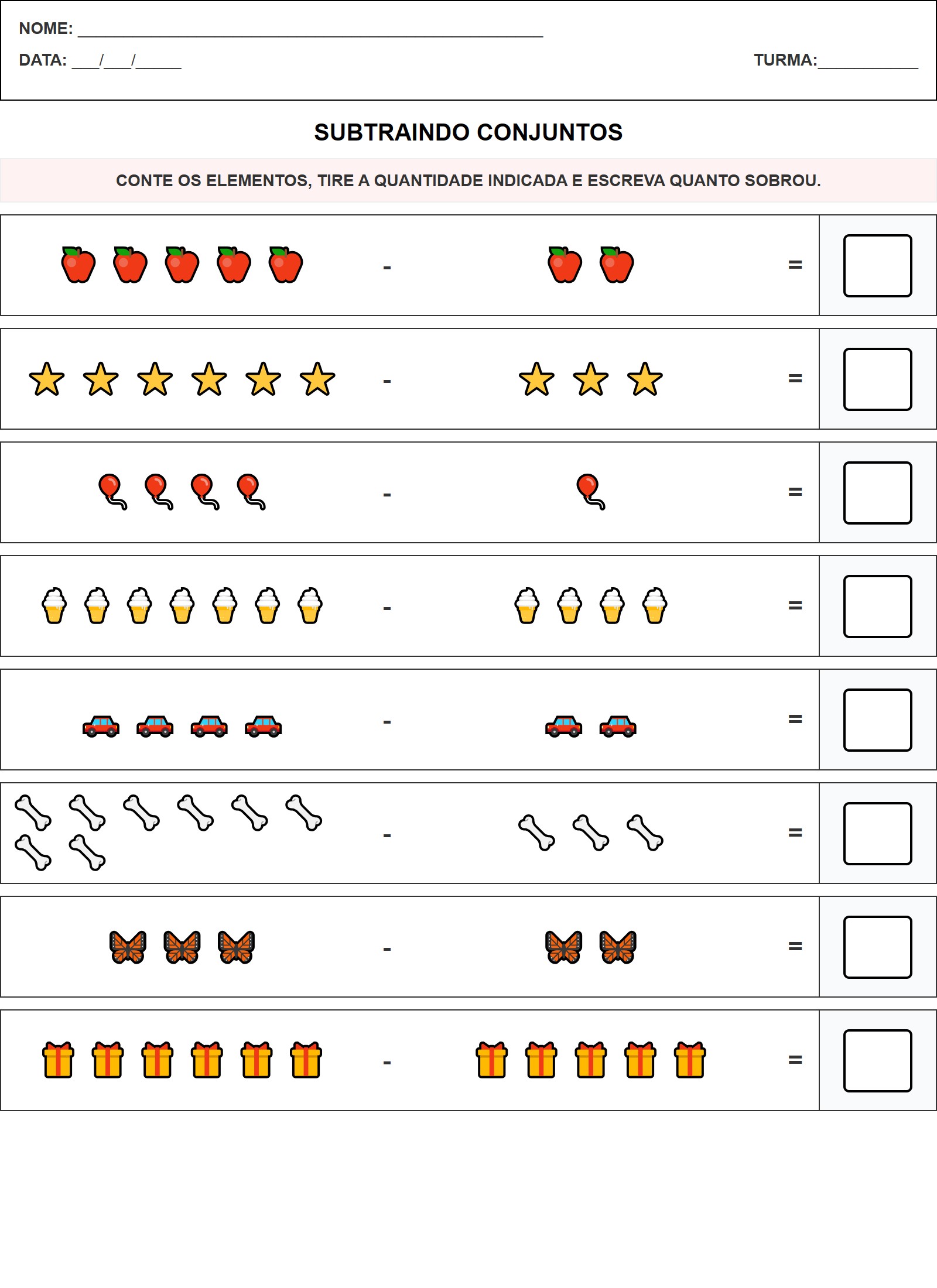 CONTE OS ELEMENTOS, TIRE A QUANTIDADE INDICADA E ESCREVA QUANTO SOBROU.