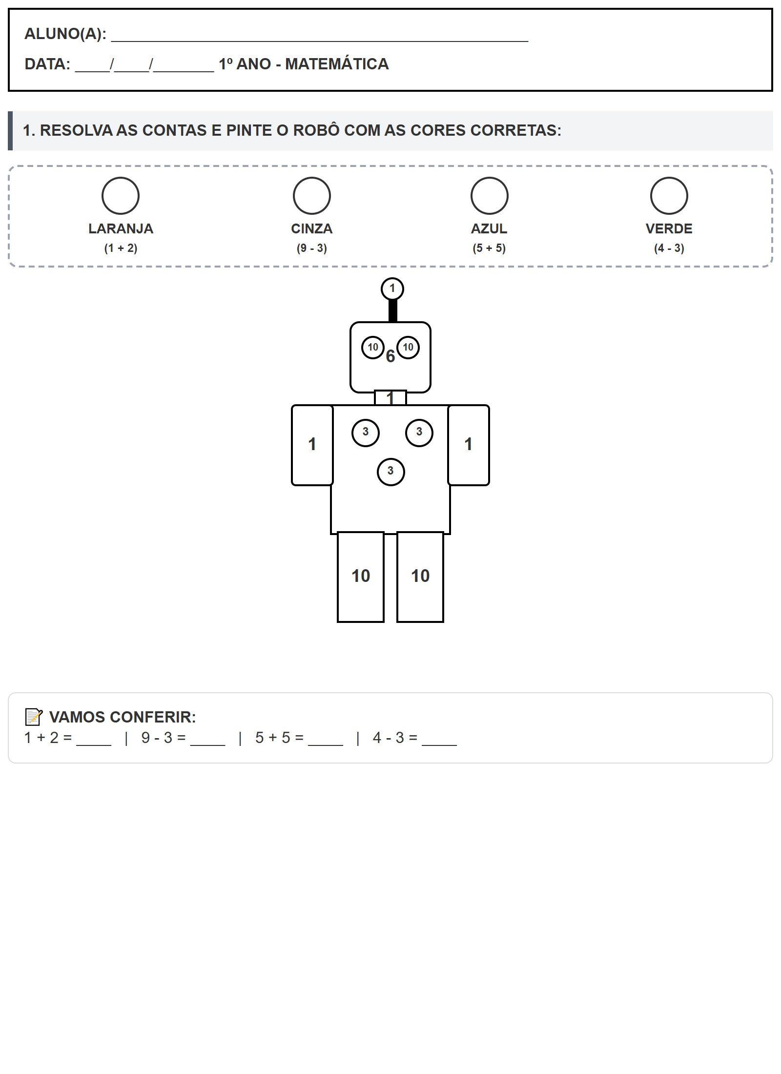 1. RESOLVA AS CONTAS E PINTE O ROBÔ COM AS CORES CORRETAS: