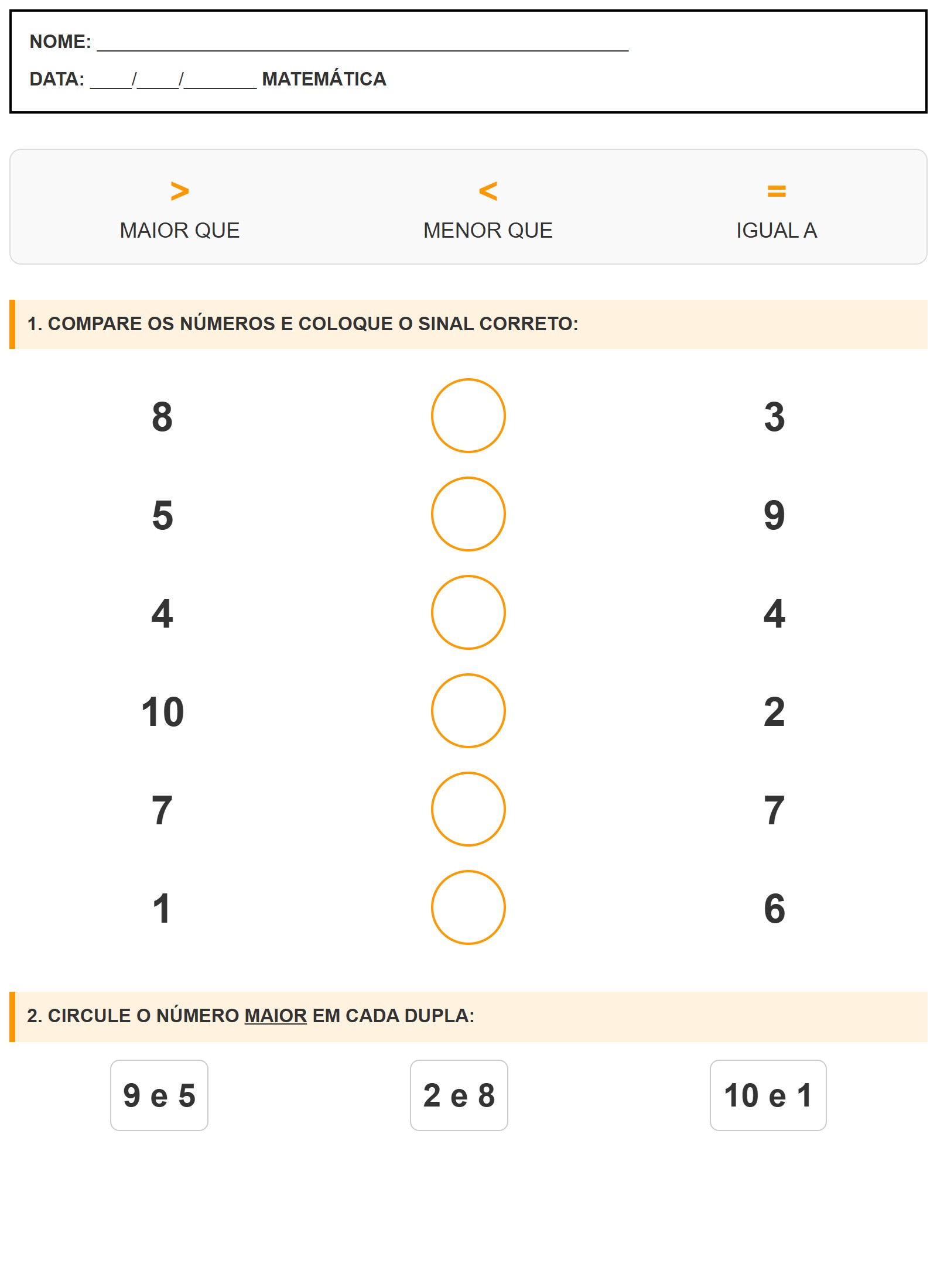 1. COMPARE OS NÚMEROS E COLOQUE O SINAL CORRETO: