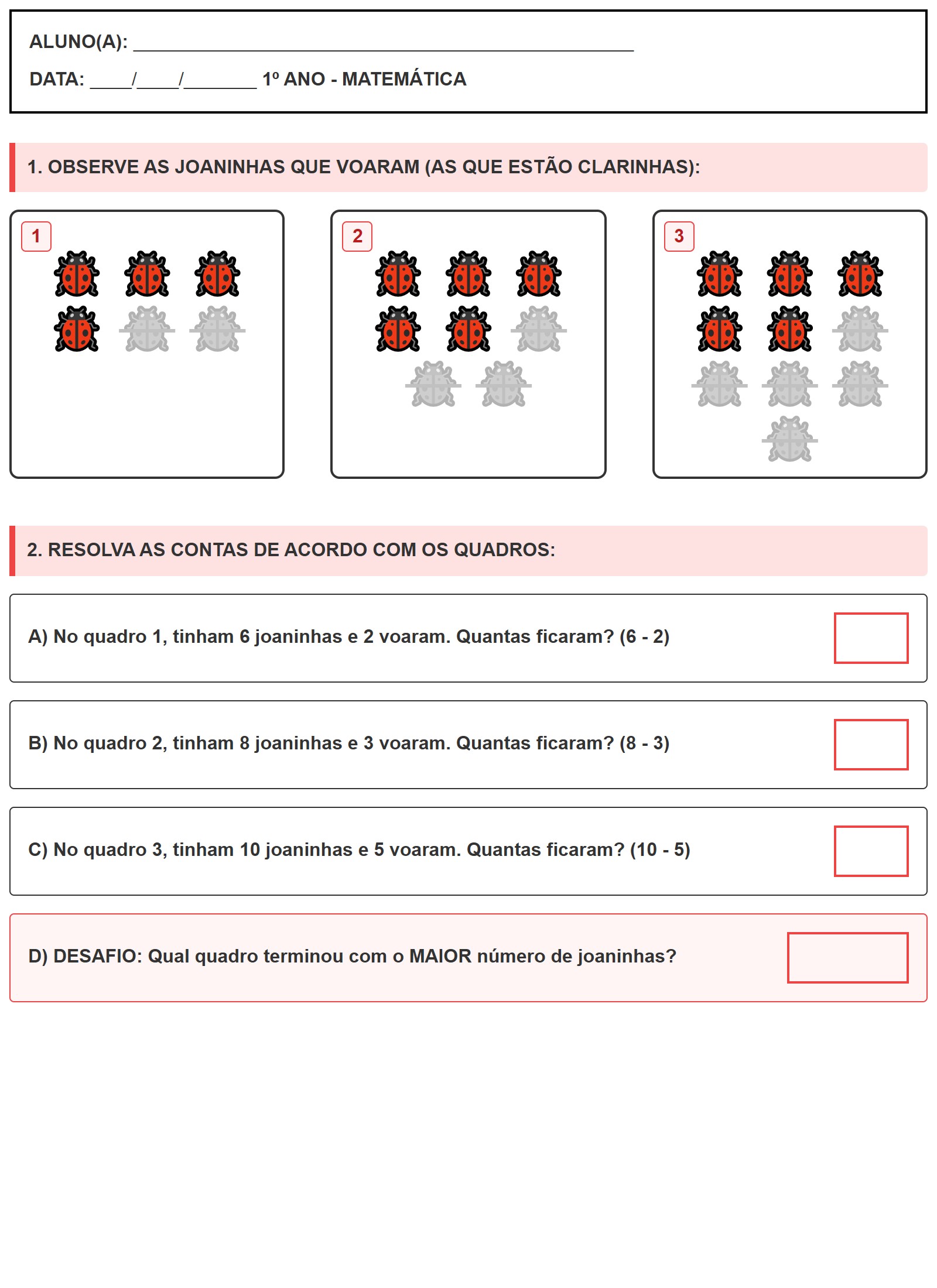 C) No quadro 3, tinham 10 joaninhas e 5 voaram. Quantas ficaram? (10 - 5)