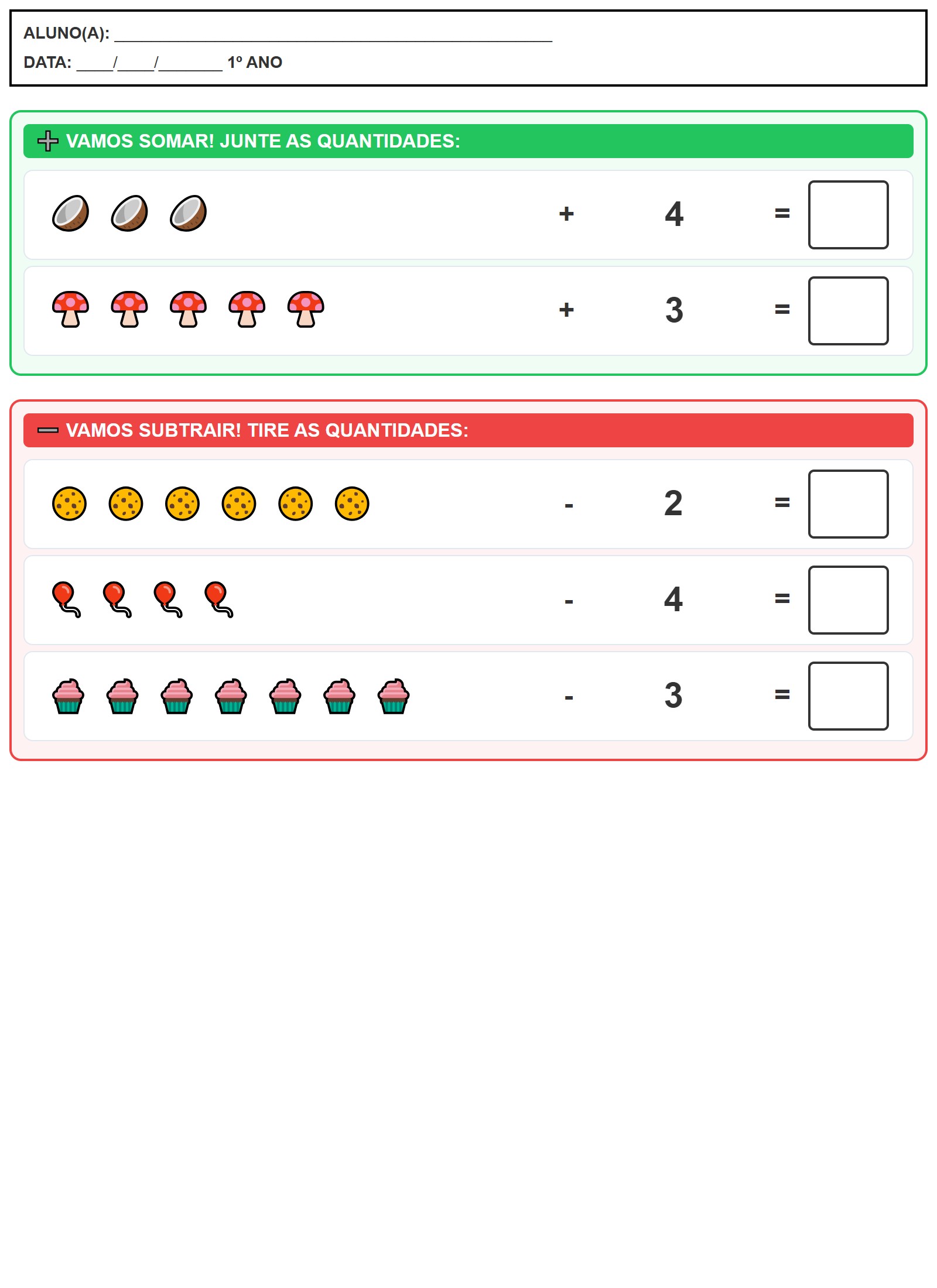 Atividade de Matemática 1º Ano – Adição e Subtração Simples