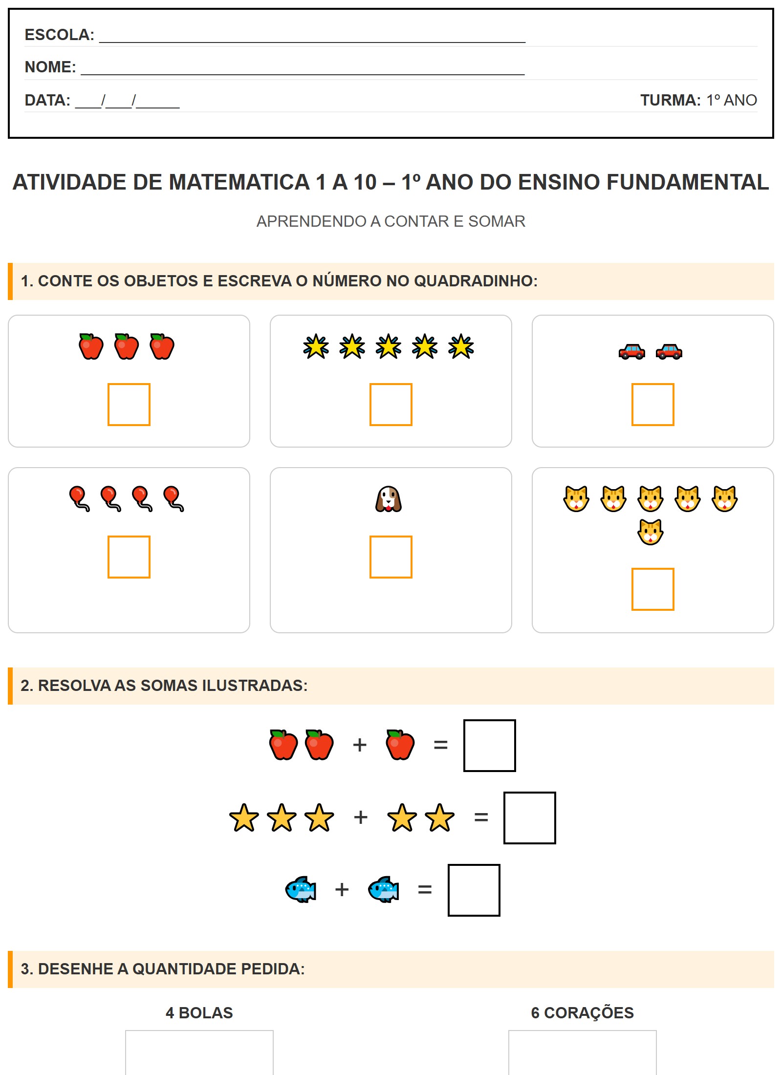 Atividade de Matematica 1 A 10 – 1º Ano do Ensino Fundamental