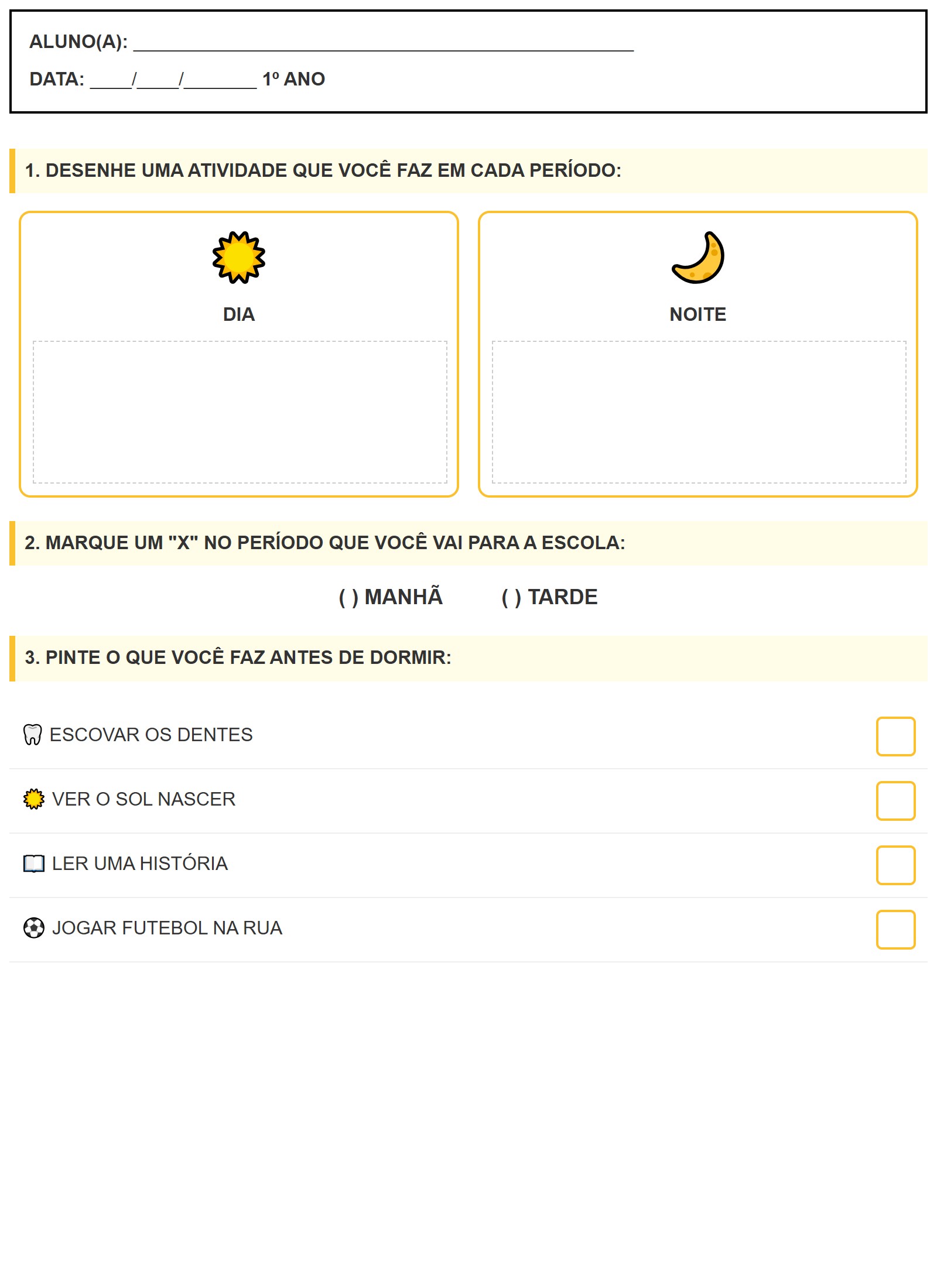 1. DESENHE UMA ATIVIDADE QUE VOCÊ FAZ EM CADA PERÍODO: