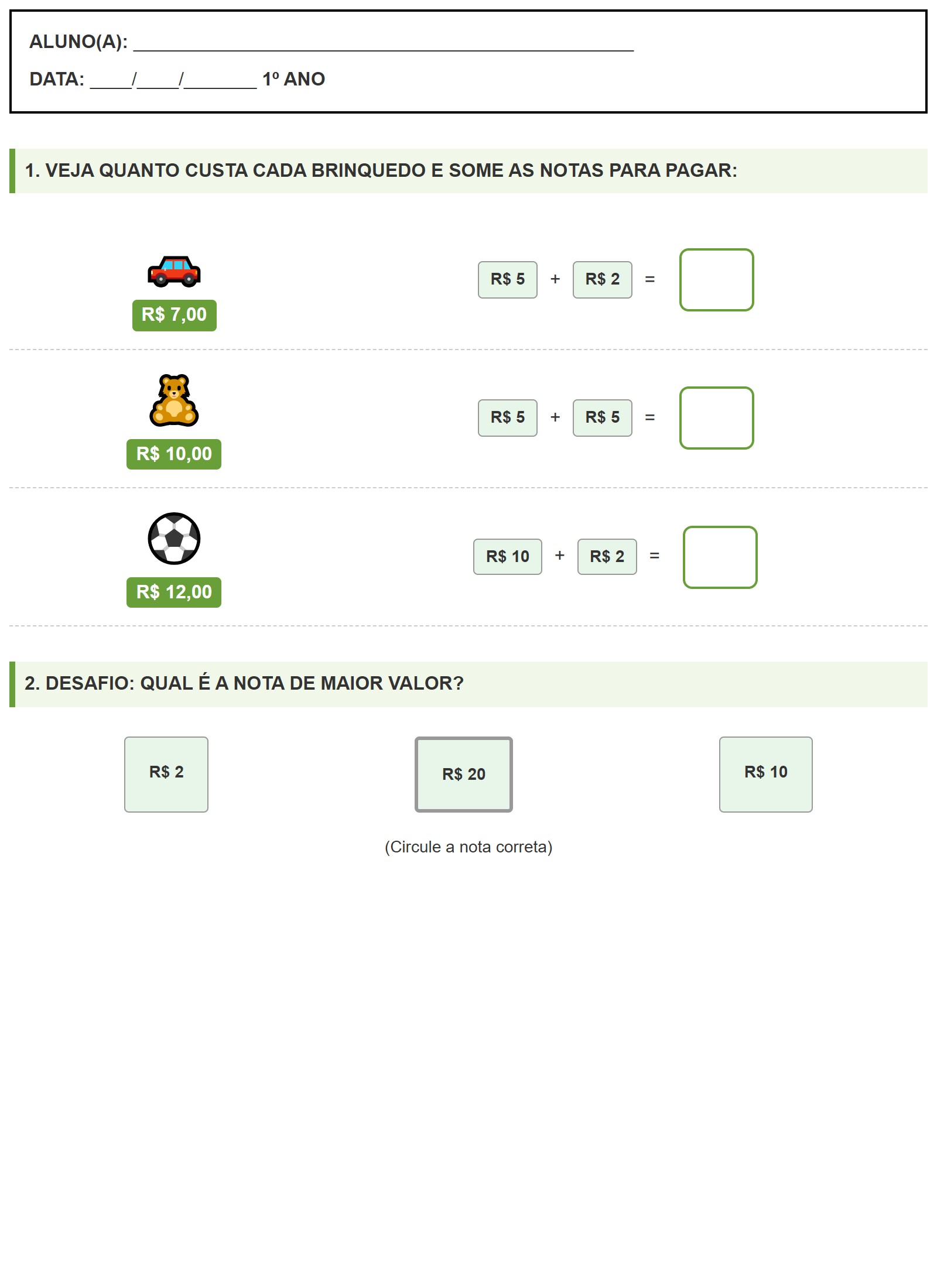 1. VEJA QUANTO CUSTA CADA BRINQUEDO E SOME AS NOTAS PARA PAGAR: