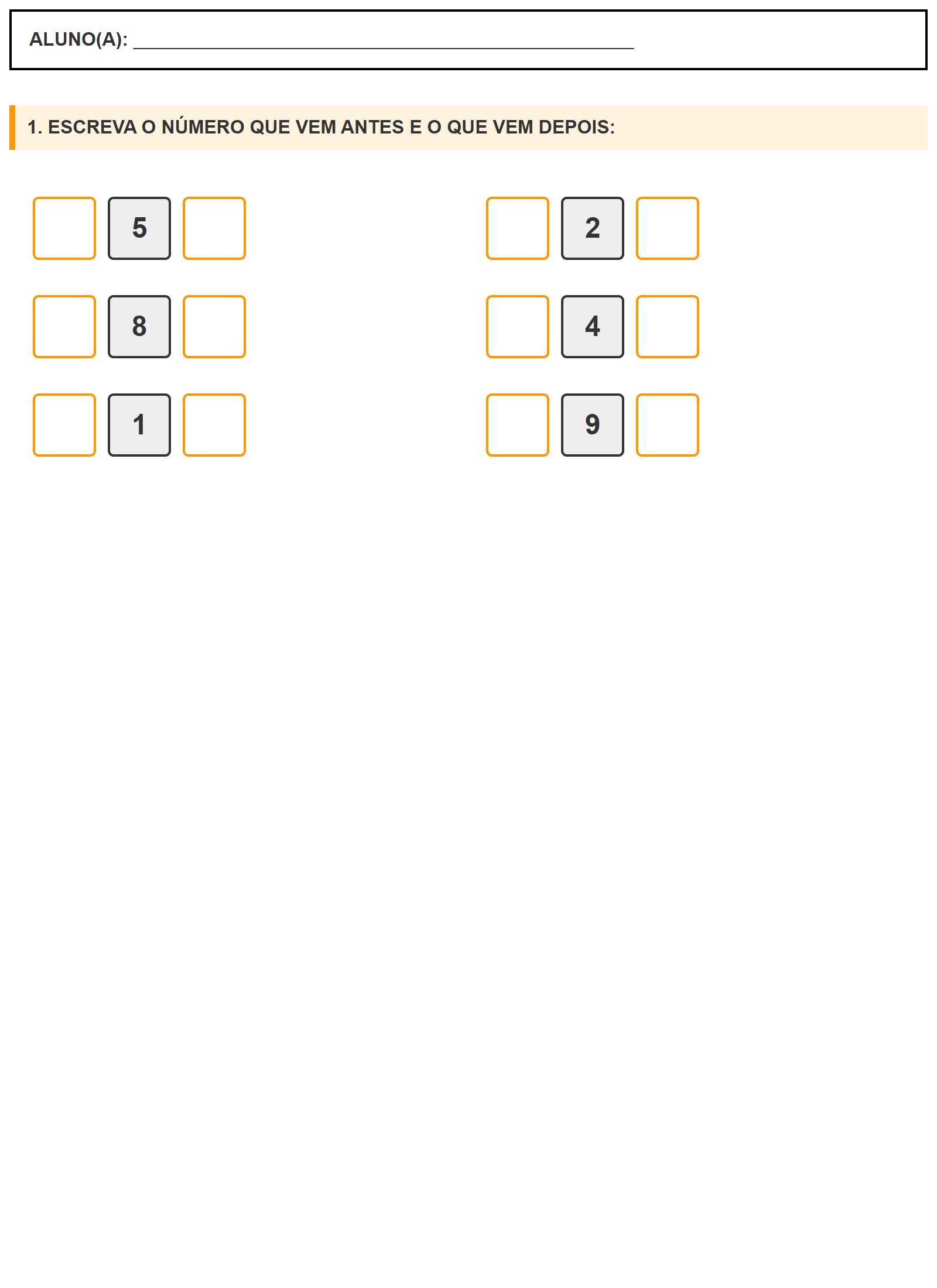 1. ESCREVA O NÚMERO QUE VEM ANTES E O QUE VEM DEPOIS: