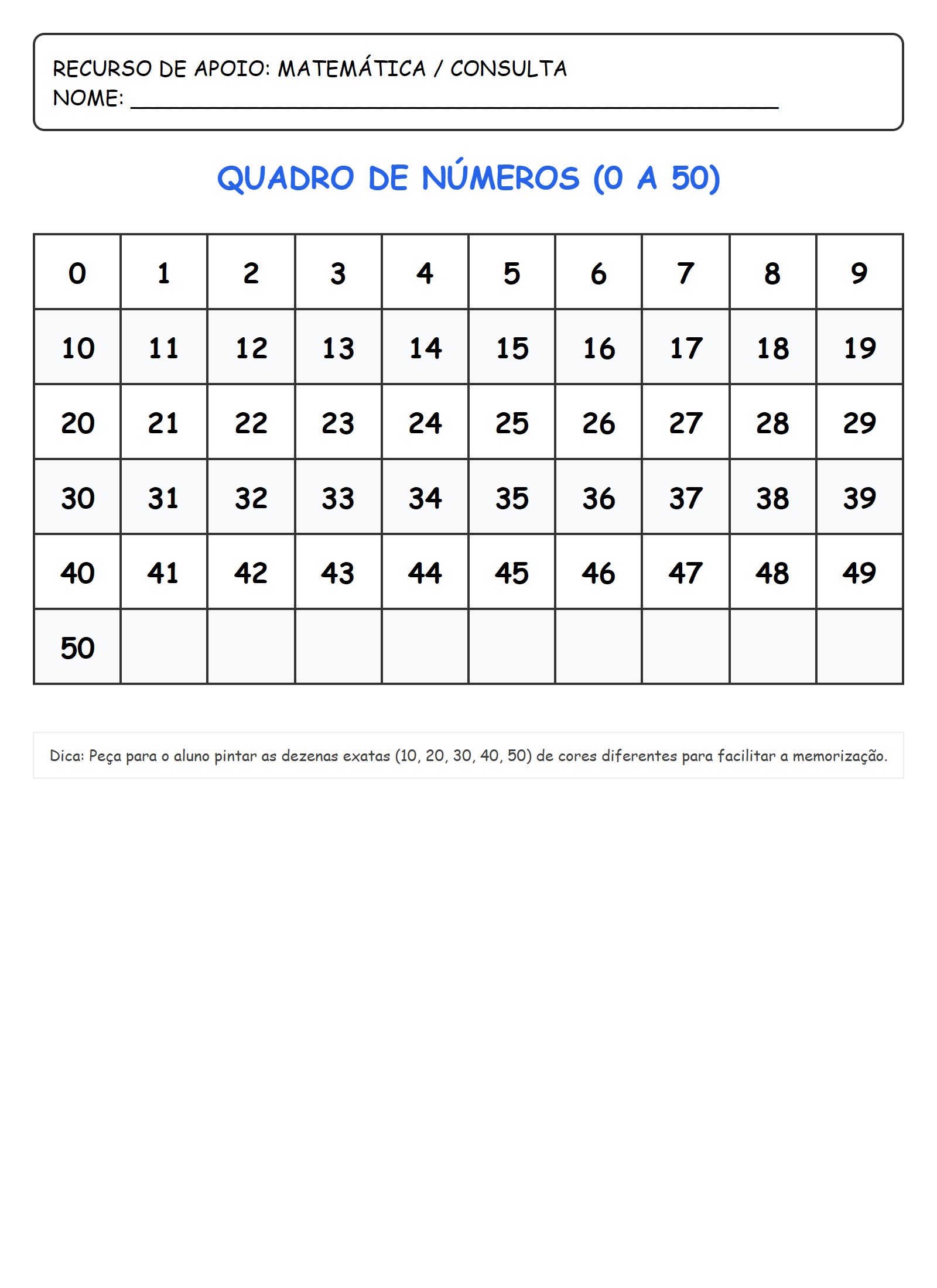 Dica: Peça para o aluno pintar as dezenas exatas (10, 20, 30, 40, 50) de cores diferentes para facilitar a memorização.