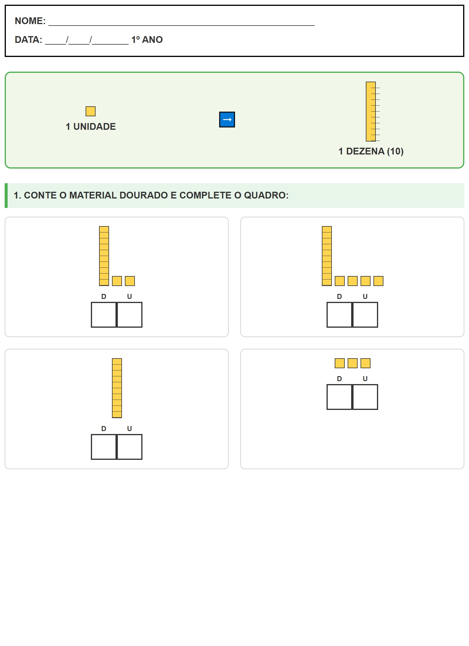 1. CONTE O MATERIAL DOURADO E COMPLETE O QUADRO: