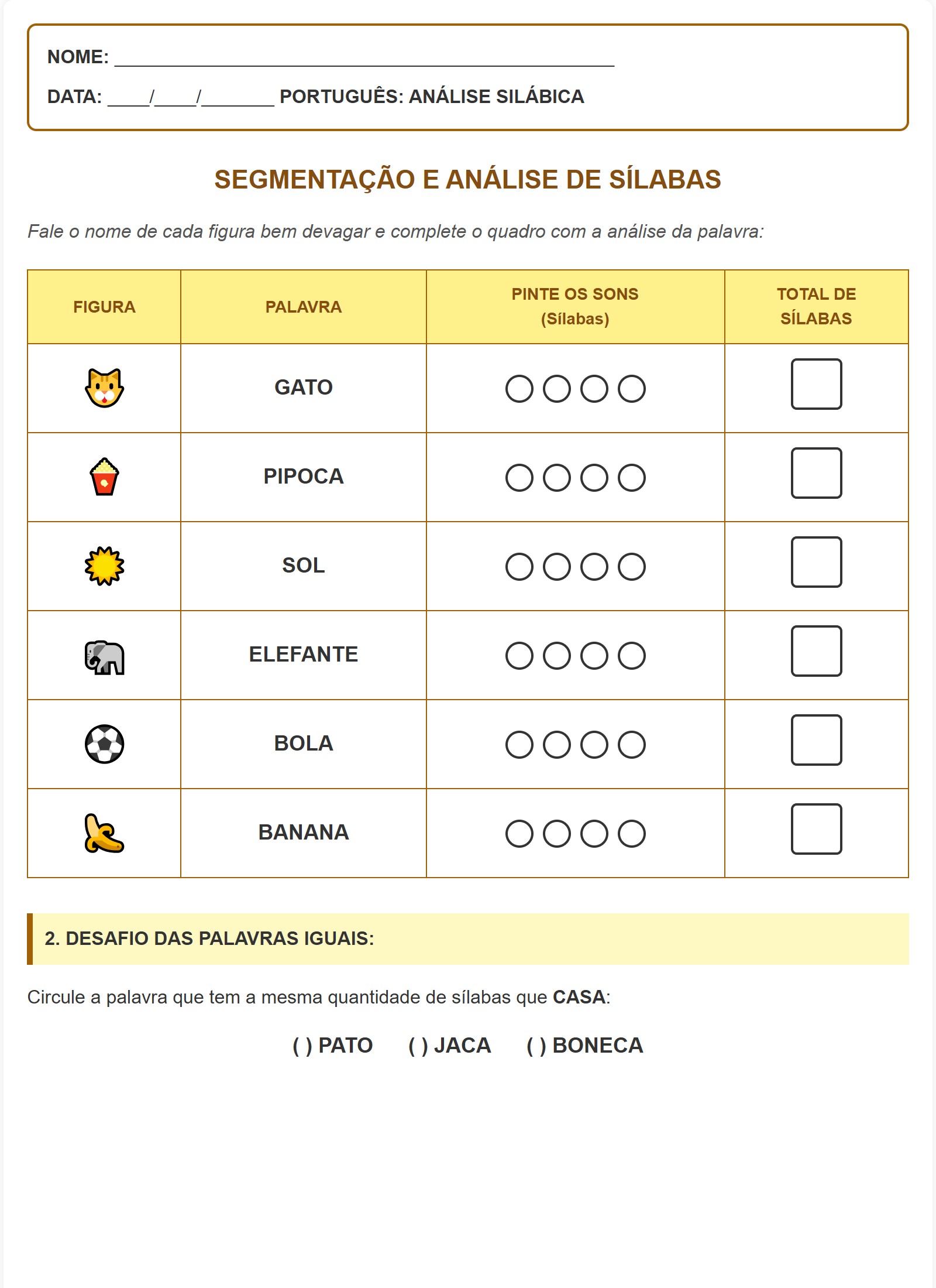 | FIGURA | PALAVRA | PINTE OS SONS (Sílabas) |