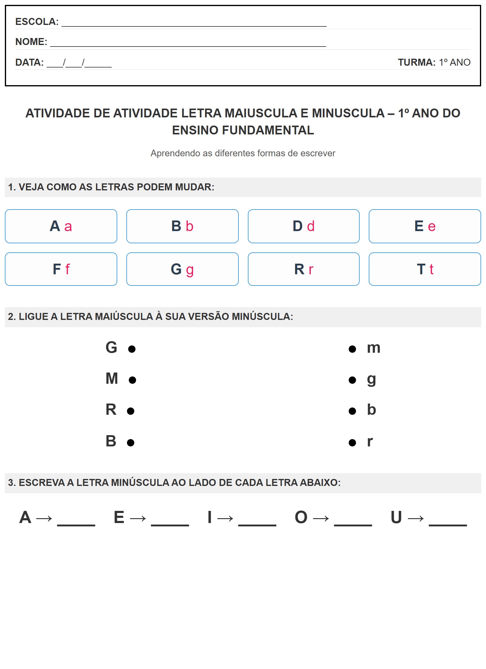 Atividade de Atividade Letra Maiuscula E Minuscula – 1º Ano do Ensino Fundamental