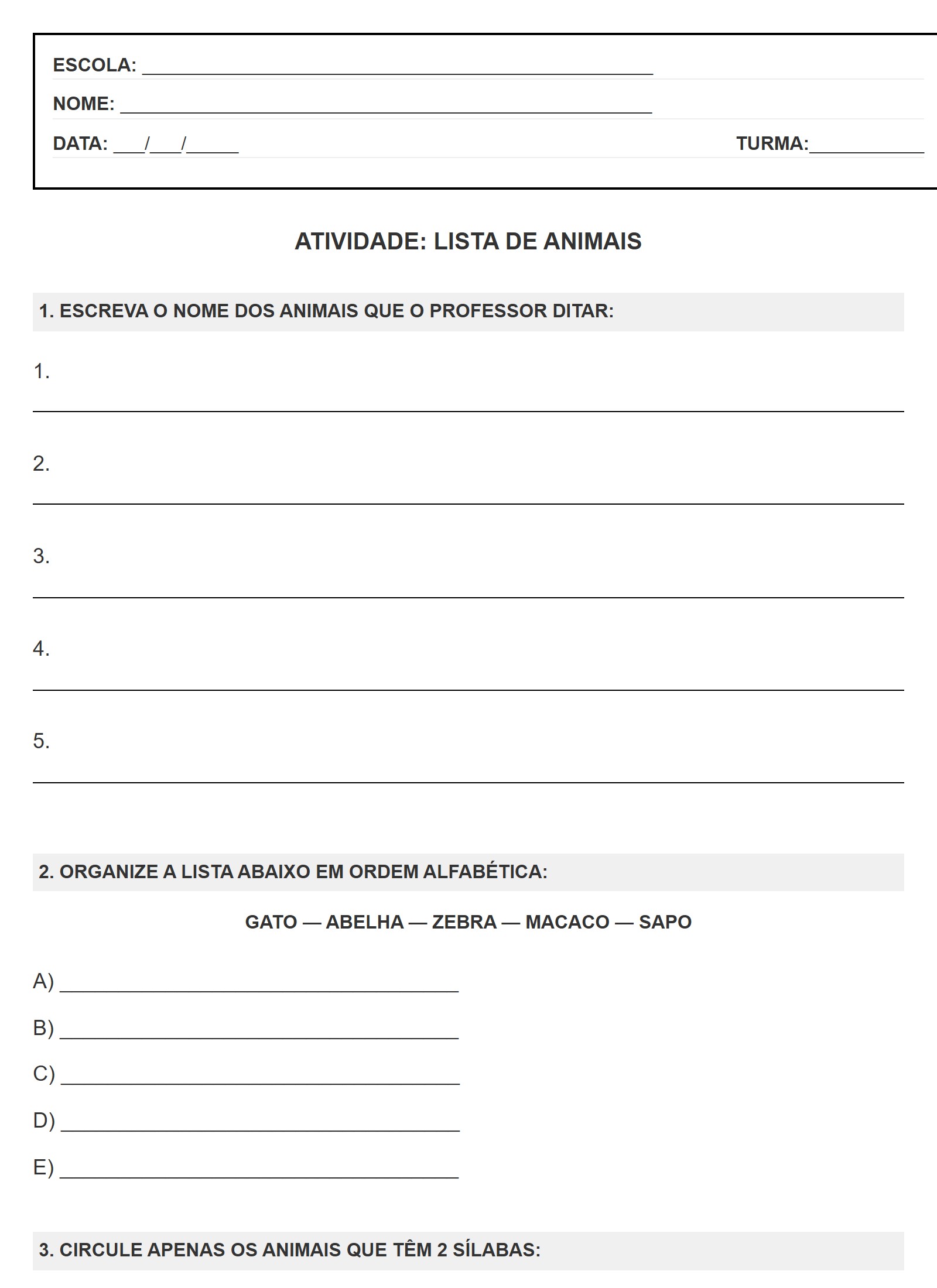 2. ORGANIZE A LISTA ABAIXO EM ORDEM ALFABÉTICA: