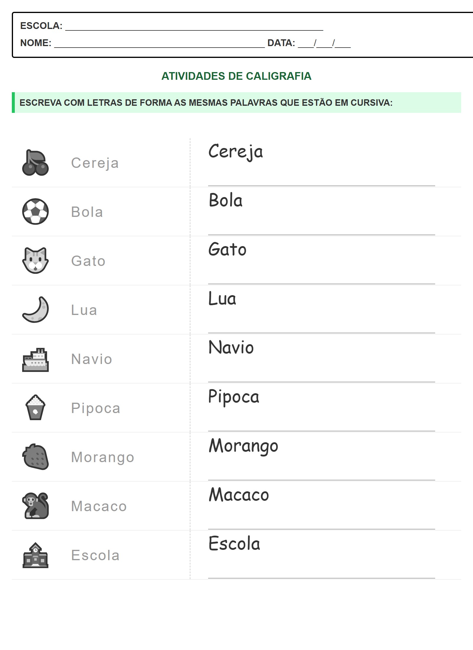ESCREVA COM LETRAS DE FORMA AS MESMAS PALAVRAS QUE ESTÃO EM CURSIVA: