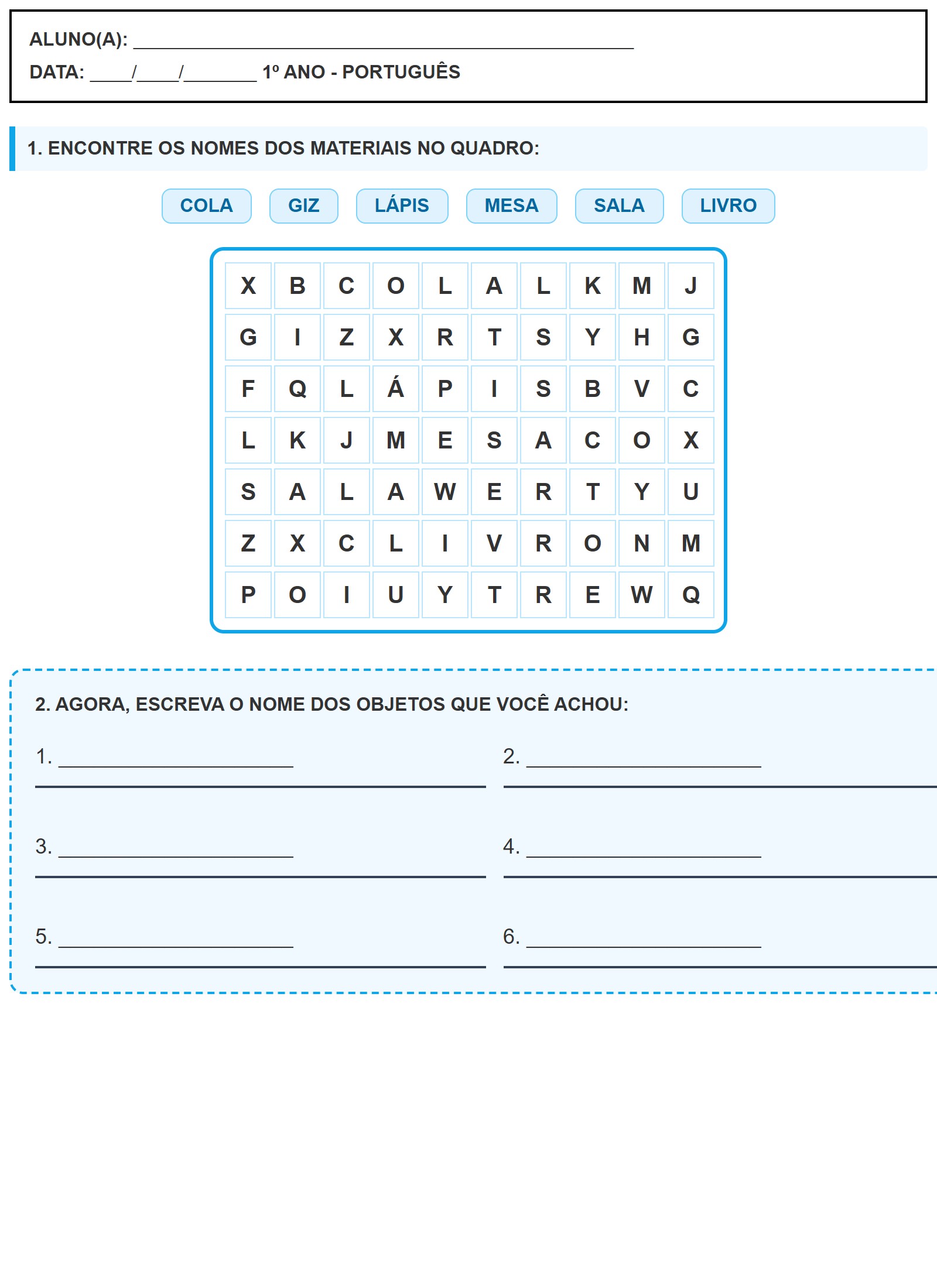 1. ENCONTRE OS NOMES DOS MATERIAIS NO QUADRO: