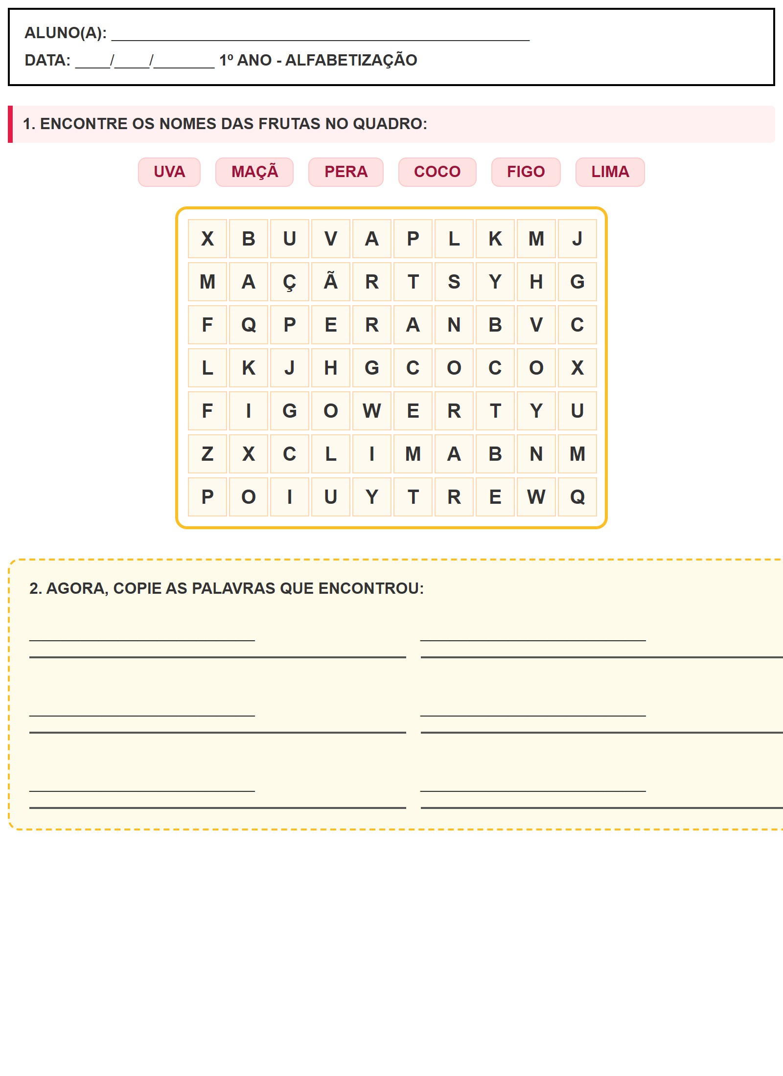 Atividade de Caca palavras frutas 1 ano para imprimir