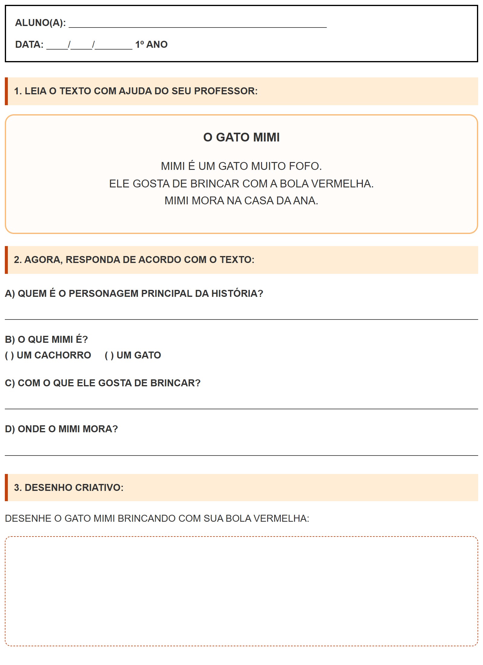 MIMI É UM GATO MUITO FOFO. ELE GOSTA DE BRINCAR COM A BOLA VERMELHA. MIMI MORA NA CASA DA ANA.