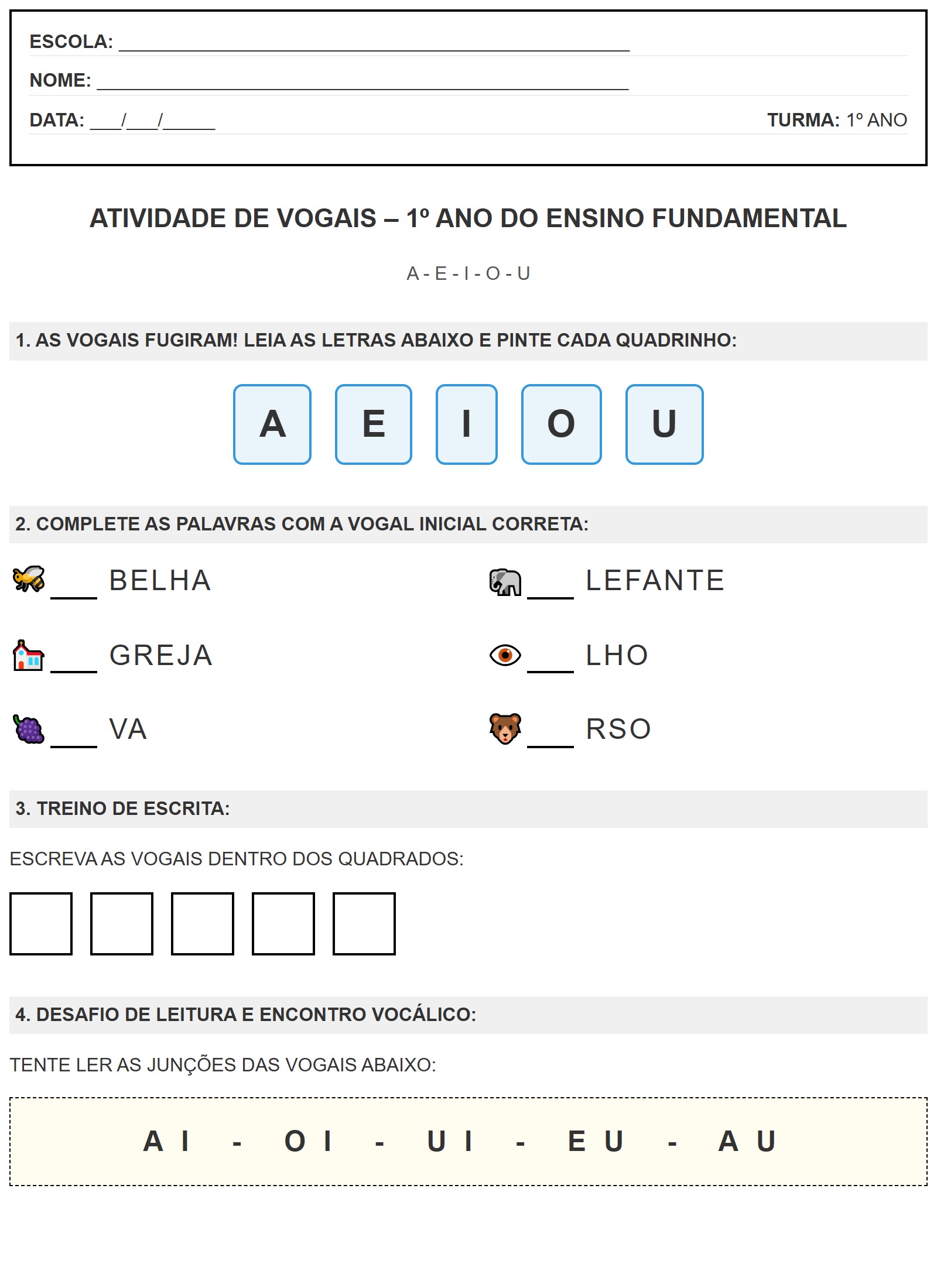 Esta atividade de vogais para o 1º ano é um recurso fundamental para o início da jornada de alfabetização. O exercício foca na identificação das cinco vogais (A, E, I, O, U) através da associação com figuras ilustrativas (como abelha, elefante e uva), auxiliando na percepção do som inicial (fonema) e sua representação gráfica (grafema). Além do treino de escrita e reconhecimento, a folha apresenta um desafio de encontros vocálicos simples (AI, OI, UI), preparando o aluno para a formação das primeiras junções de sons na leitura.