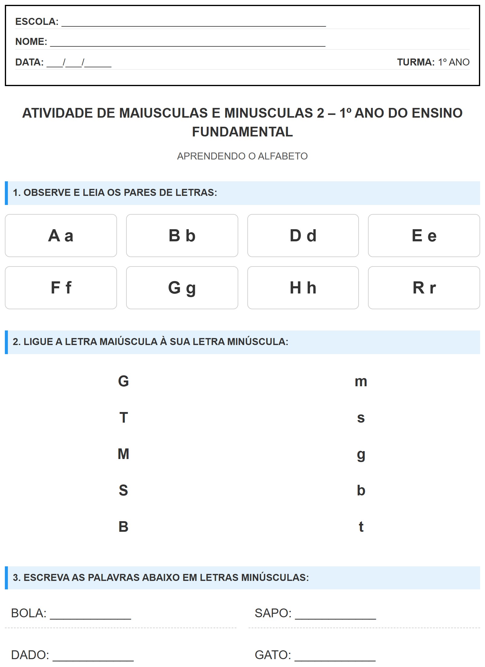 Com exercícios de associação (ligar colunas) e conversão de caixa alta para letra minúscula, o aluno pratica a percepção visual e a escrita. Ideal para professores utilizarem em sala de aula ou como tarefa de reforço escolar pronta para imprimir.