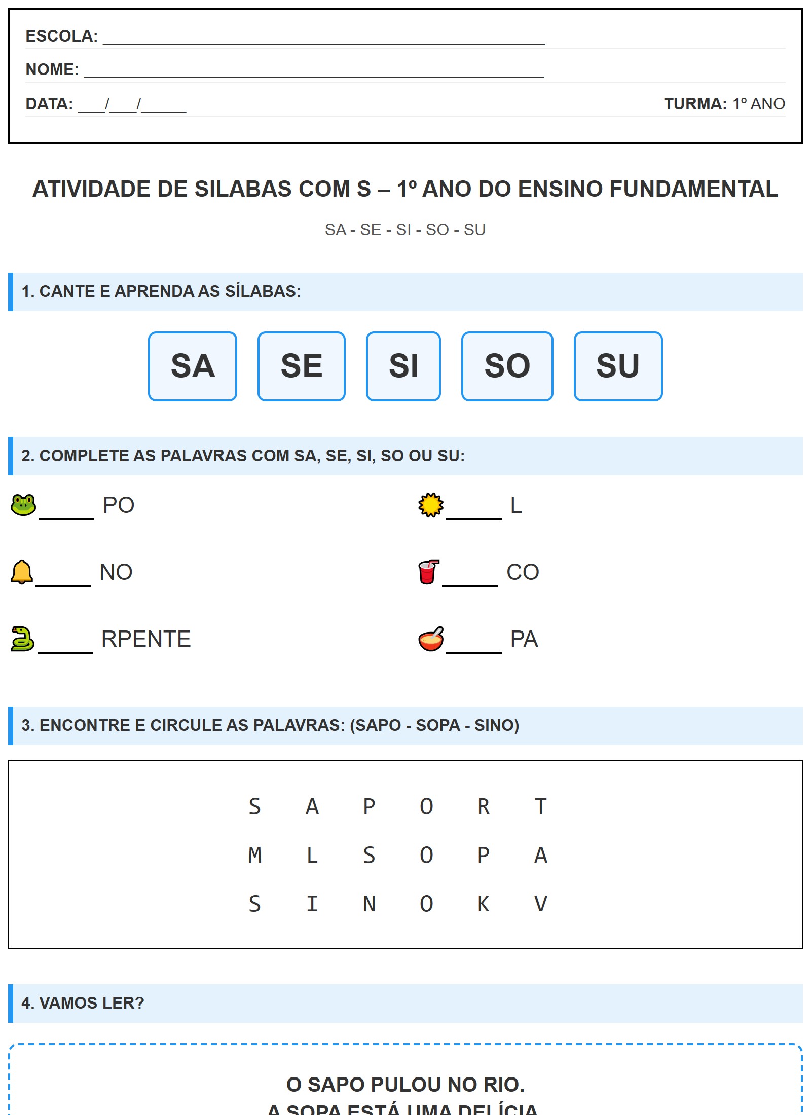 2. COMPLETE AS PALAVRAS COM SA, SE, SI, SO OU SU: