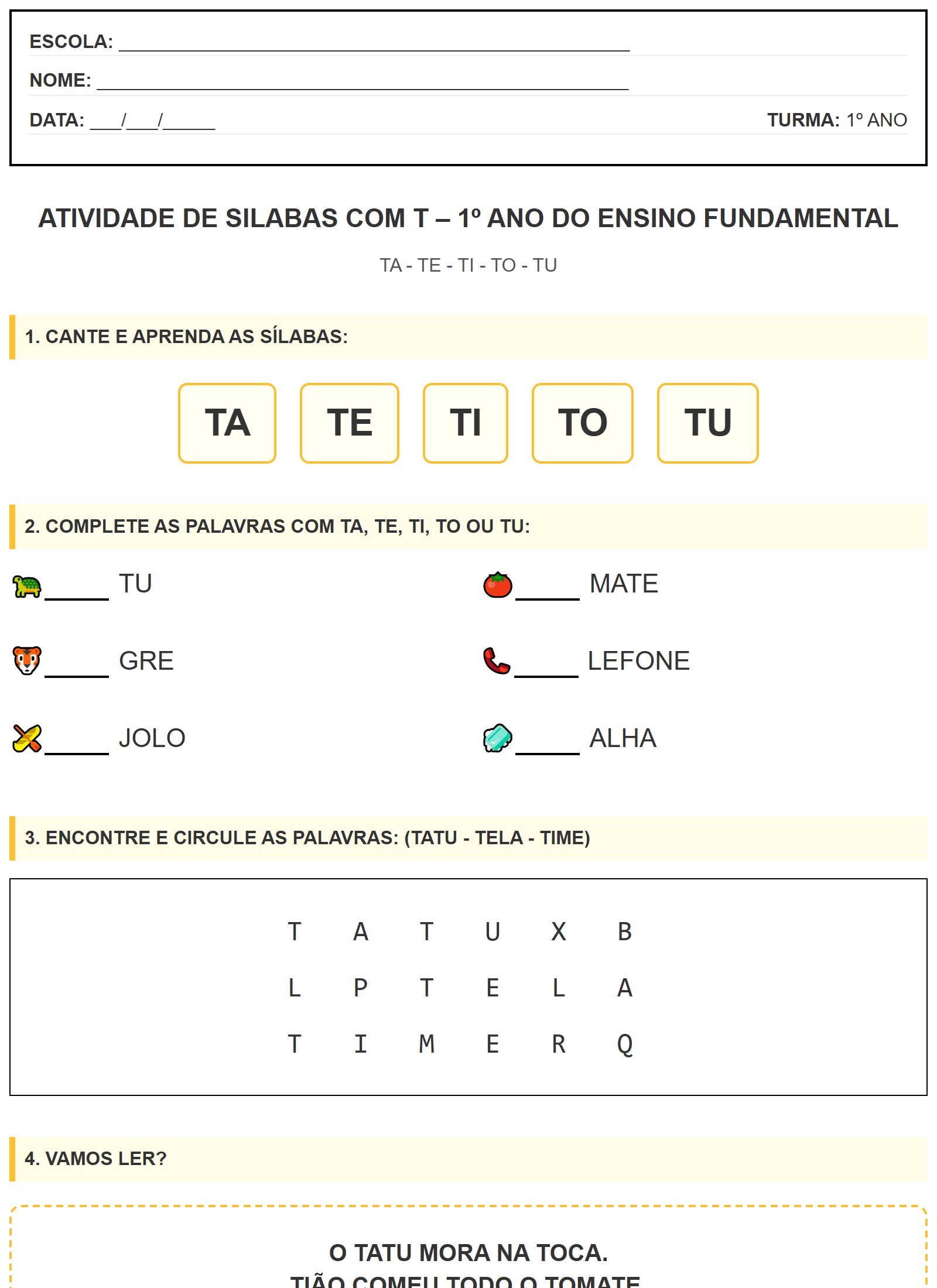Atividade de Silabas Com T – 1º Ano do Ensino Fundamental