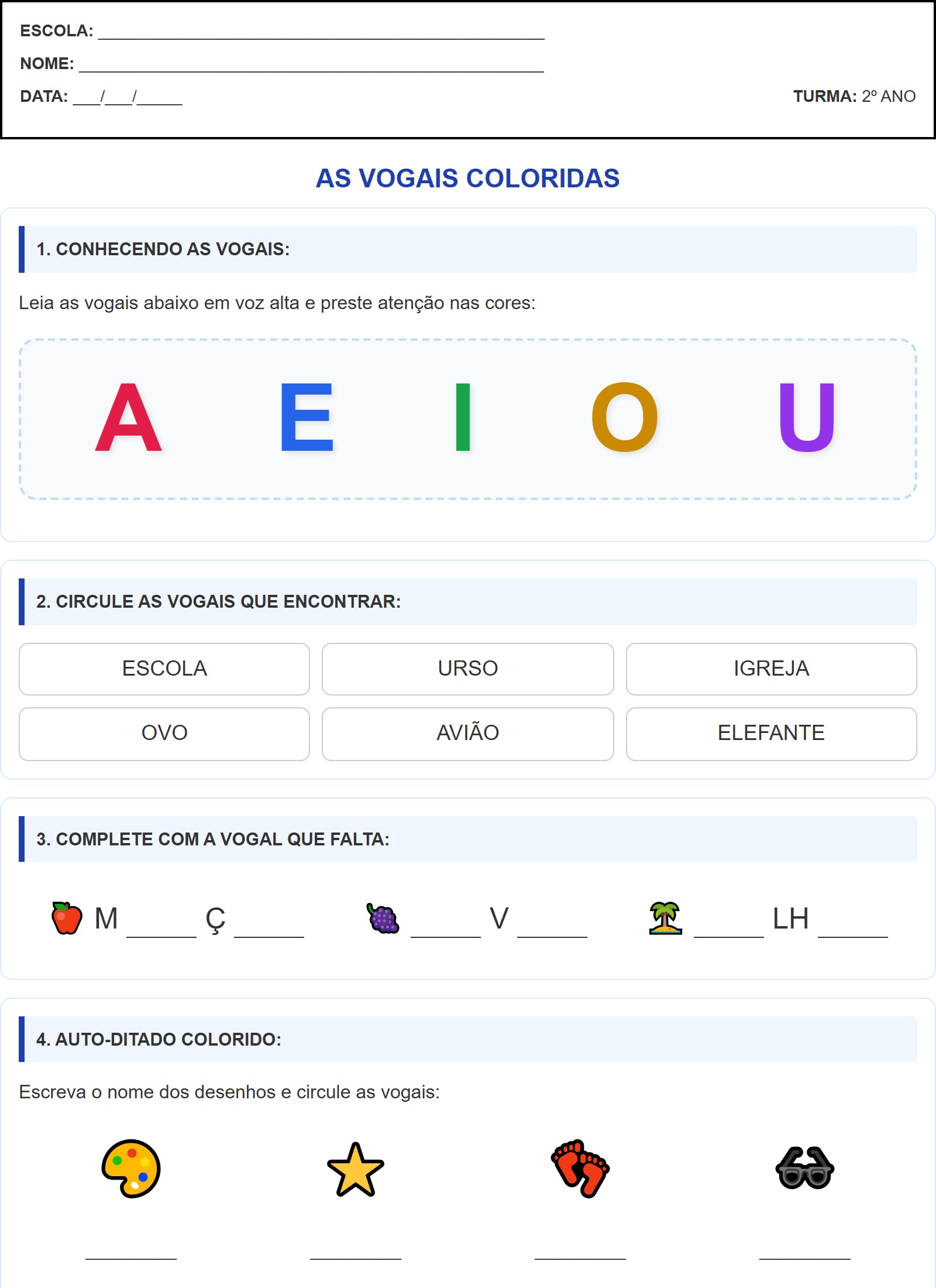 Leia as vogais abaixo em voz alta e preste atenção nas cores:
