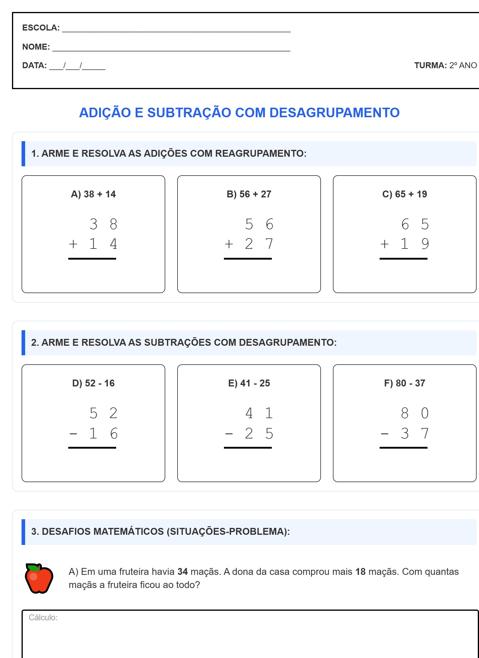 A) Em uma fruteira havia 34 maçãs. A dona da casa comprou mais 18 maçãs. Com quantas maçãs a fruteira ficou ao todo?