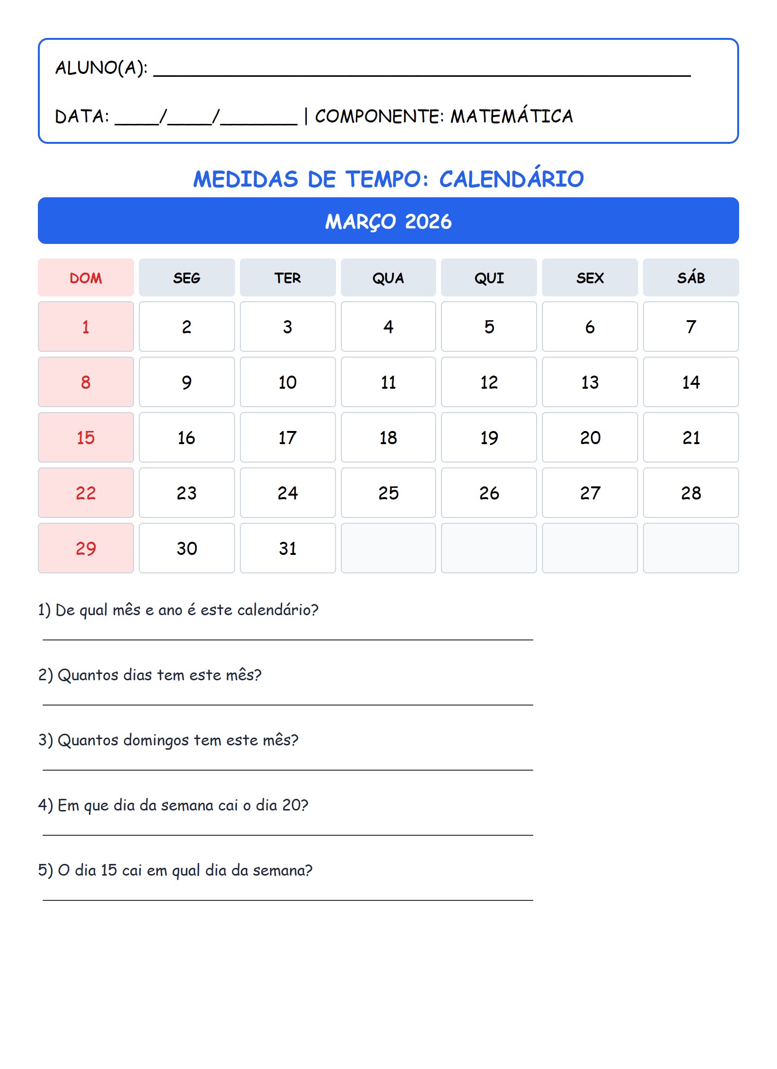 3) Quantos domingos tem este mês?