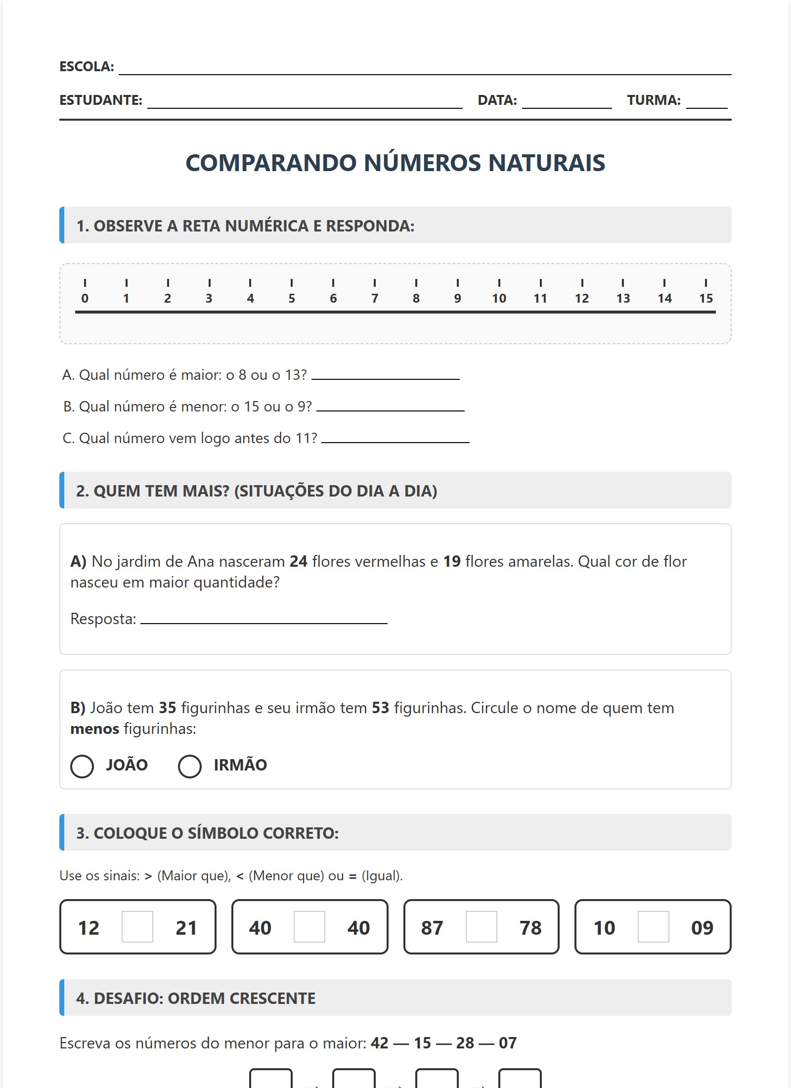 Escreva os números do menor para o maior: 42 — 15 — 28 — 07