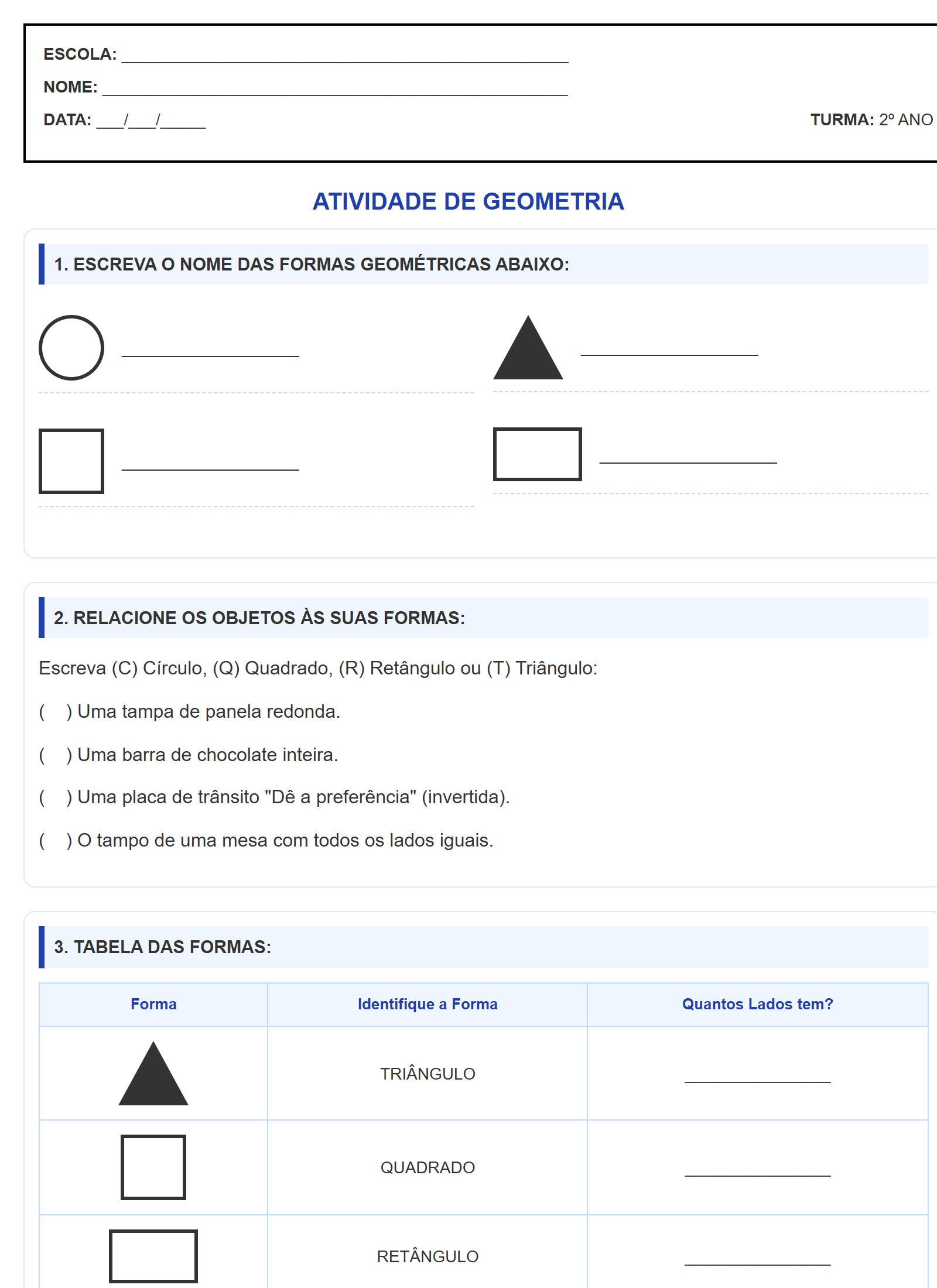 | Forma | Identifique a Forma | Quantos Lados tem? |