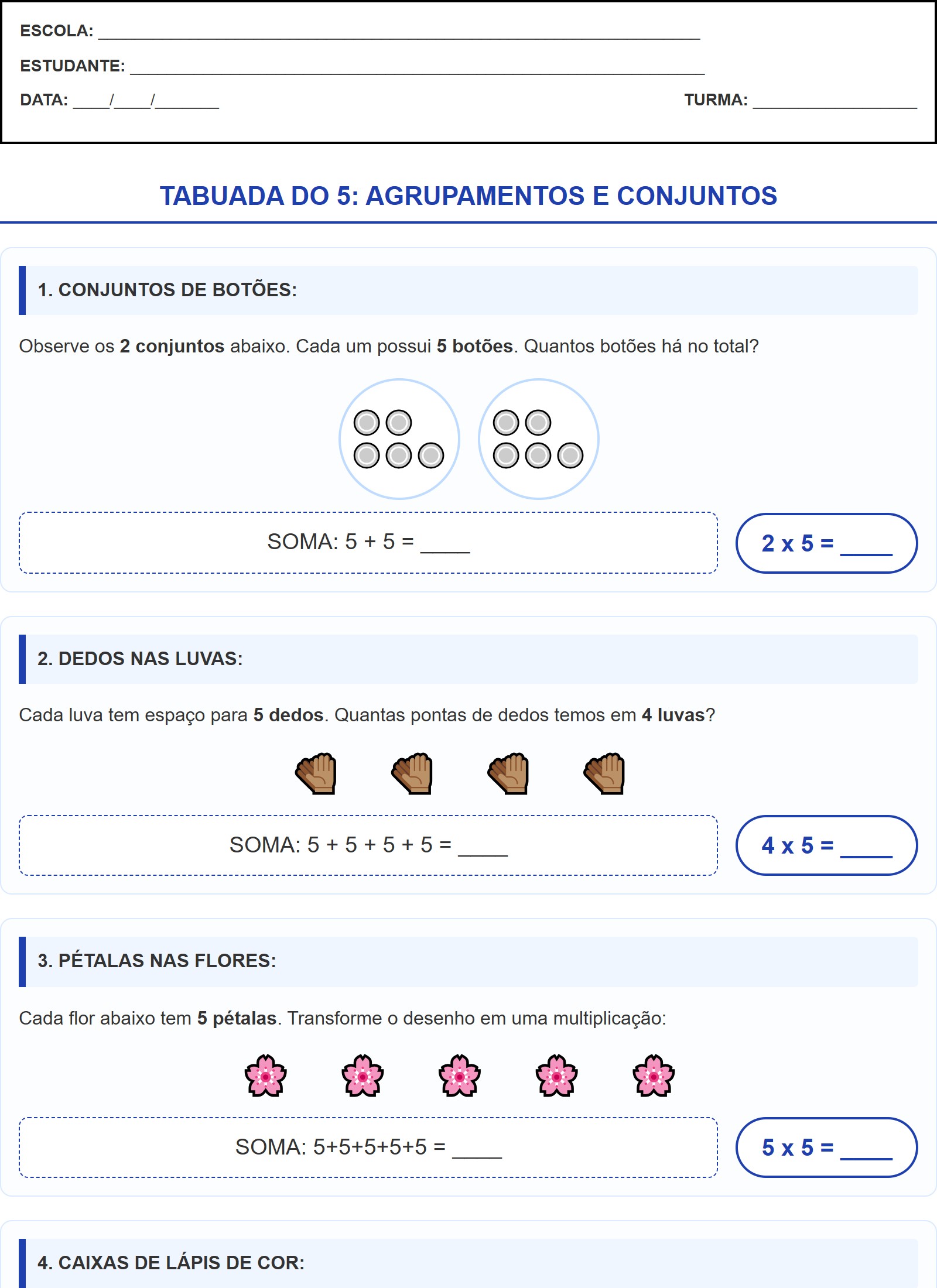 Cada flor abaixo tem 5 pétalas. Transforme o desenho em uma multiplicação: