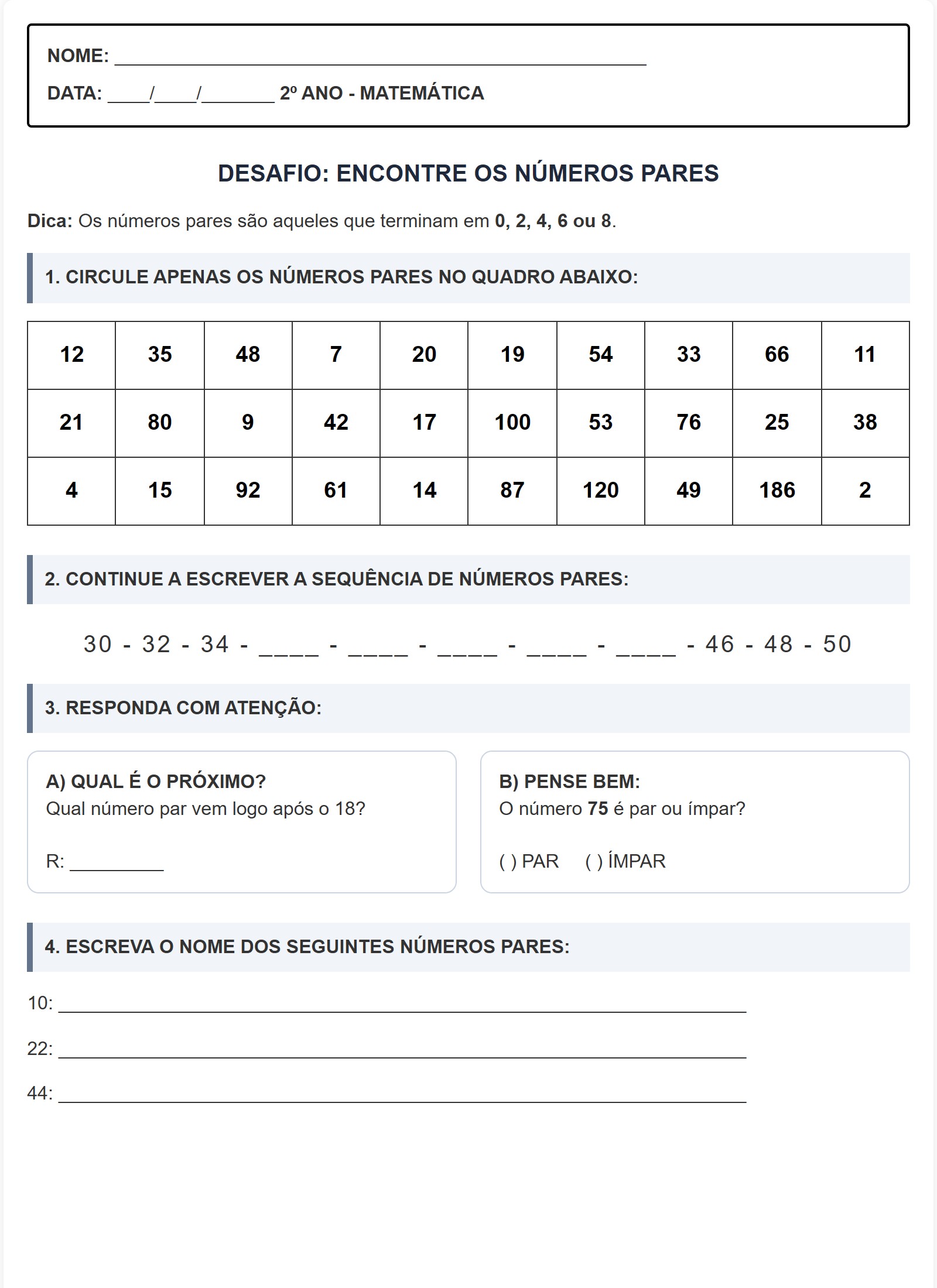 Dica: Os números pares são aqueles que terminam em 0, 2, 4, 6 ou 8.
