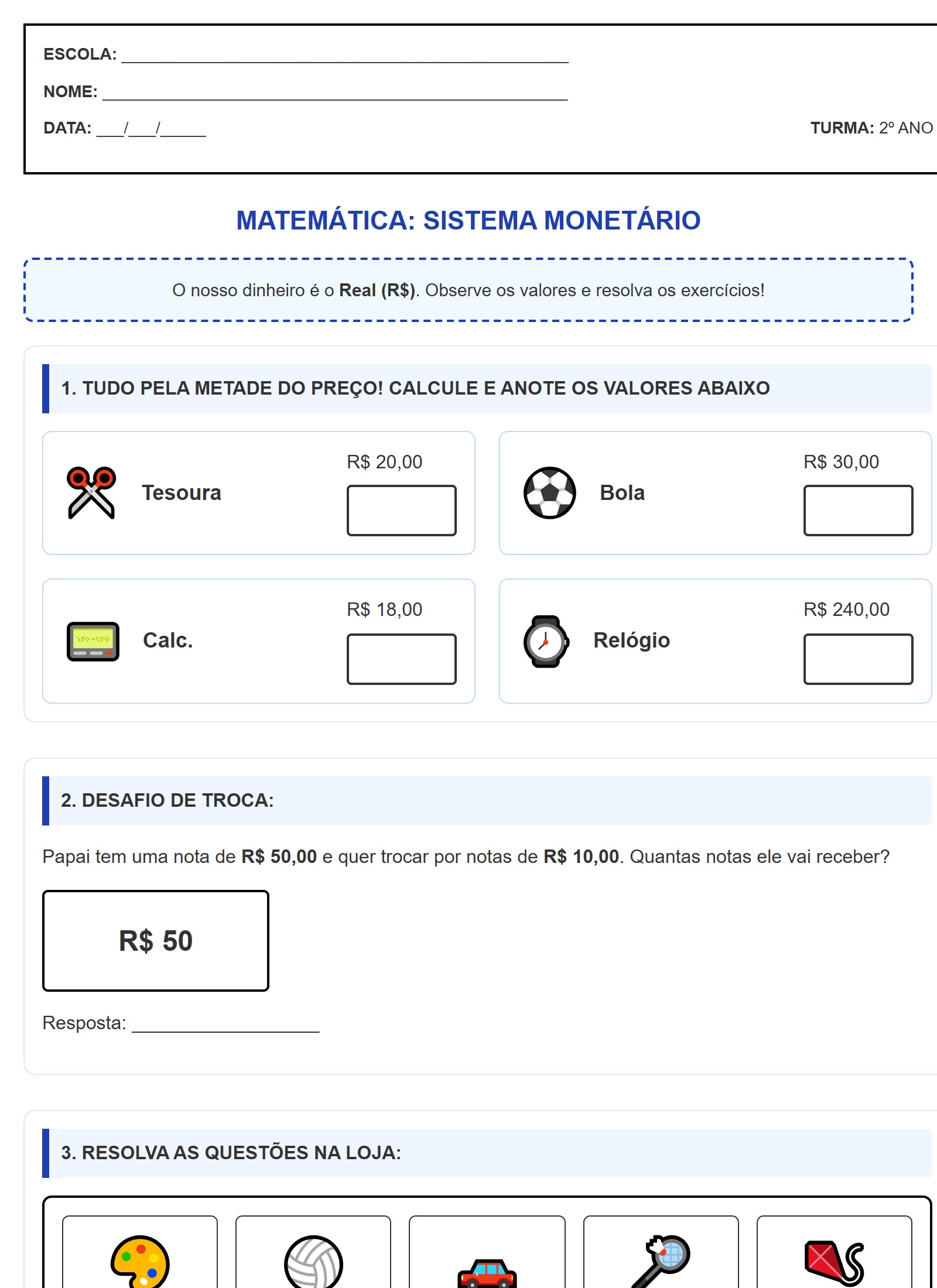 Papai tem uma nota de R$ 50,00 e quer trocar por notas de R$ 10,00. Quantas notas ele vai receber?