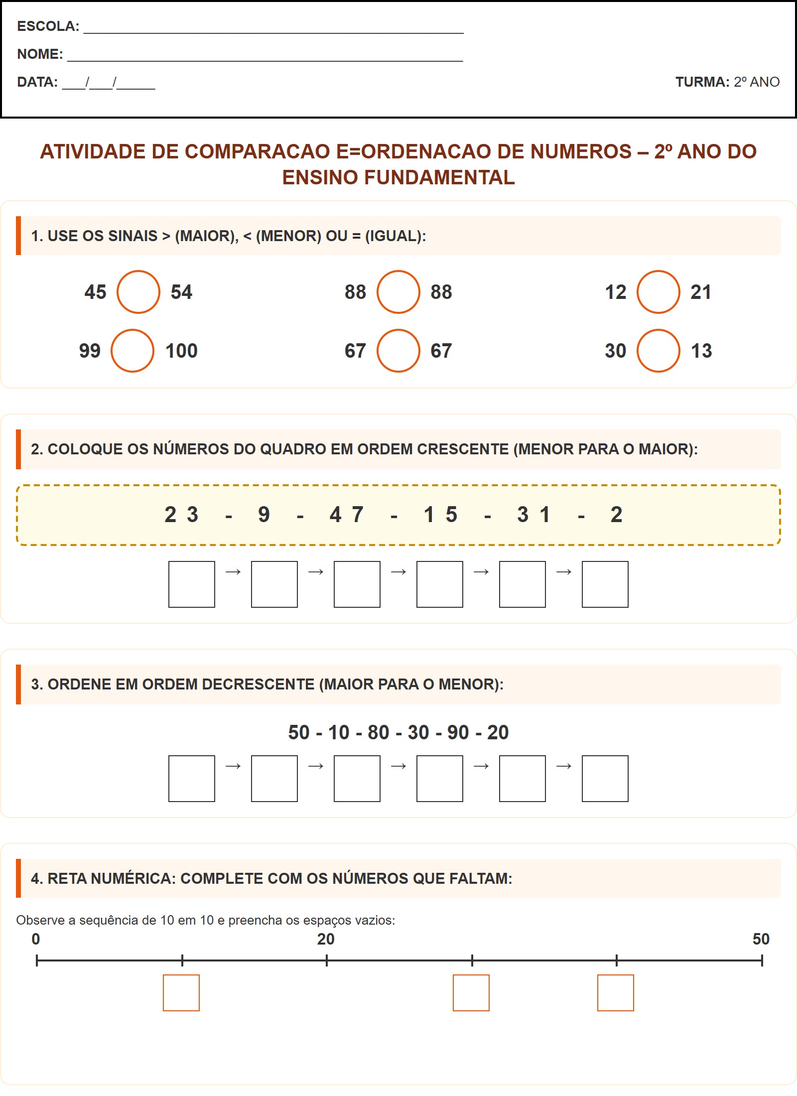 Atividade de Comparacao E=ordenacao De Numeros – 2º Ano do Ensino Fundamental