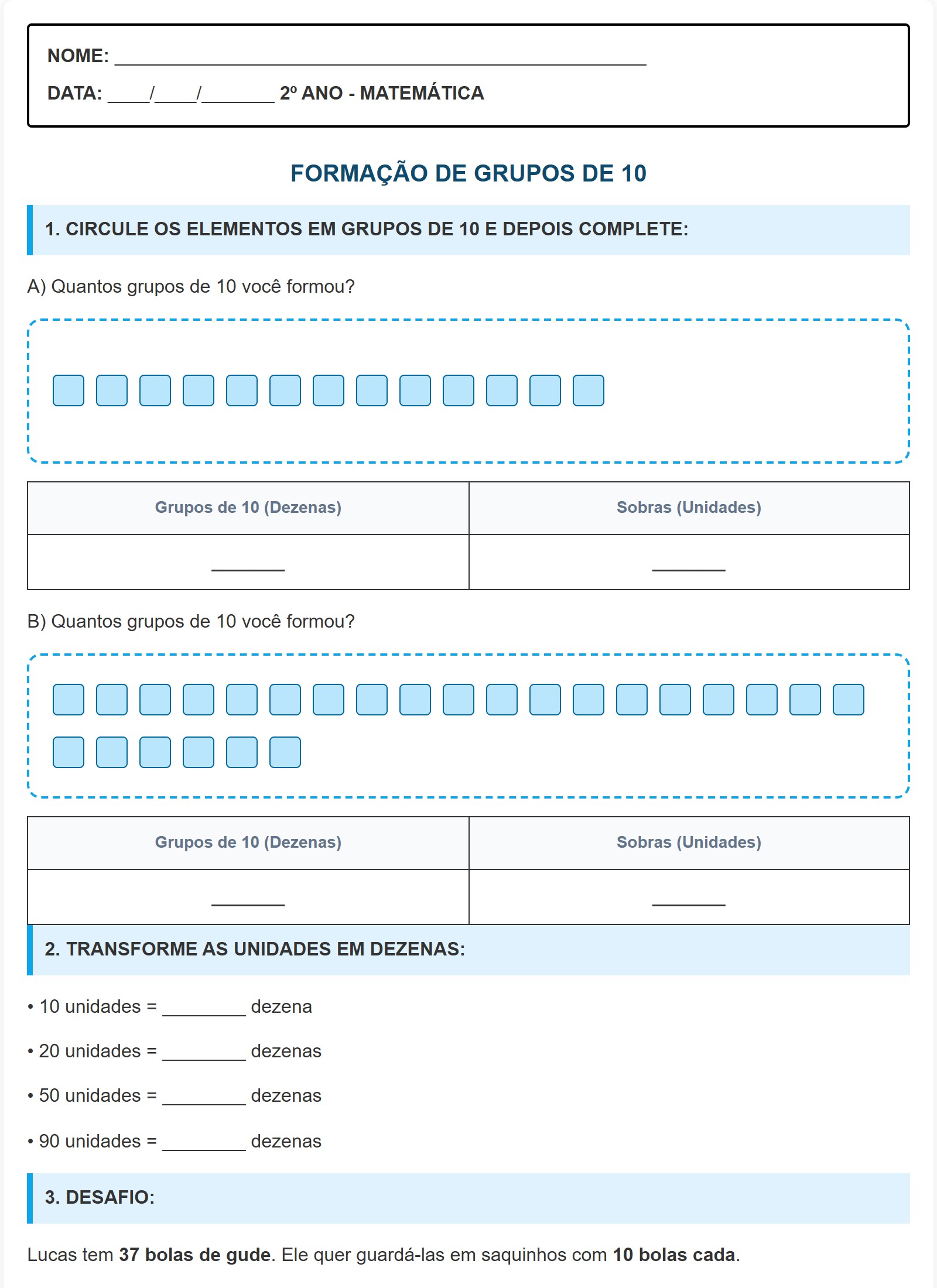 • 10 unidades = ________ dezena
