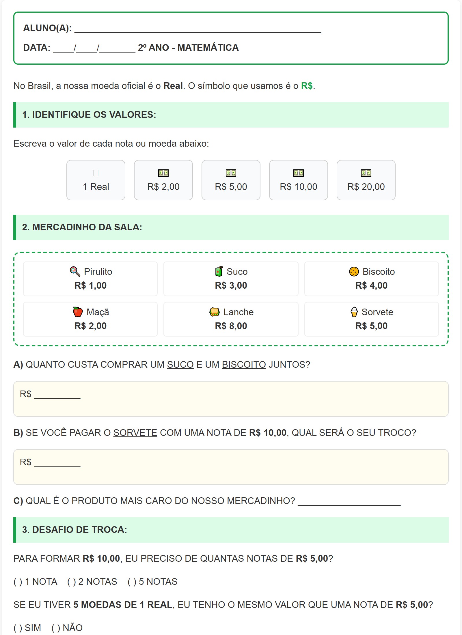 3. DESAFIO DE TROCA:PARA FORMAR R$ 10,00, EU PRECISO DE QUANTAS NOTAS DE R$ 5,00?