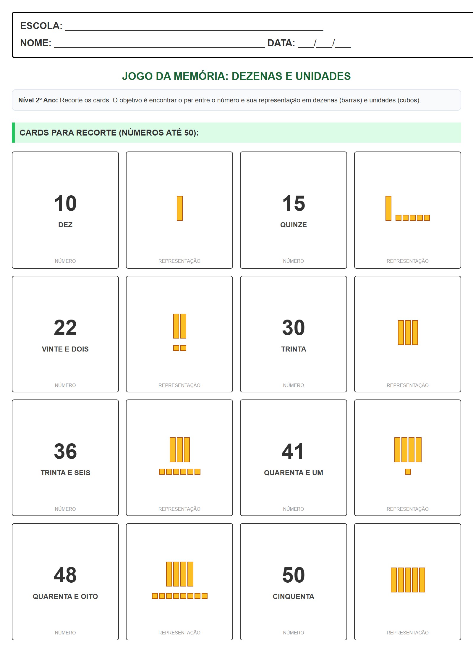Recorte os cards. O objetivo é encontrar o par entre o número e sua representação em dezenas (barras) e unidades (cubos).