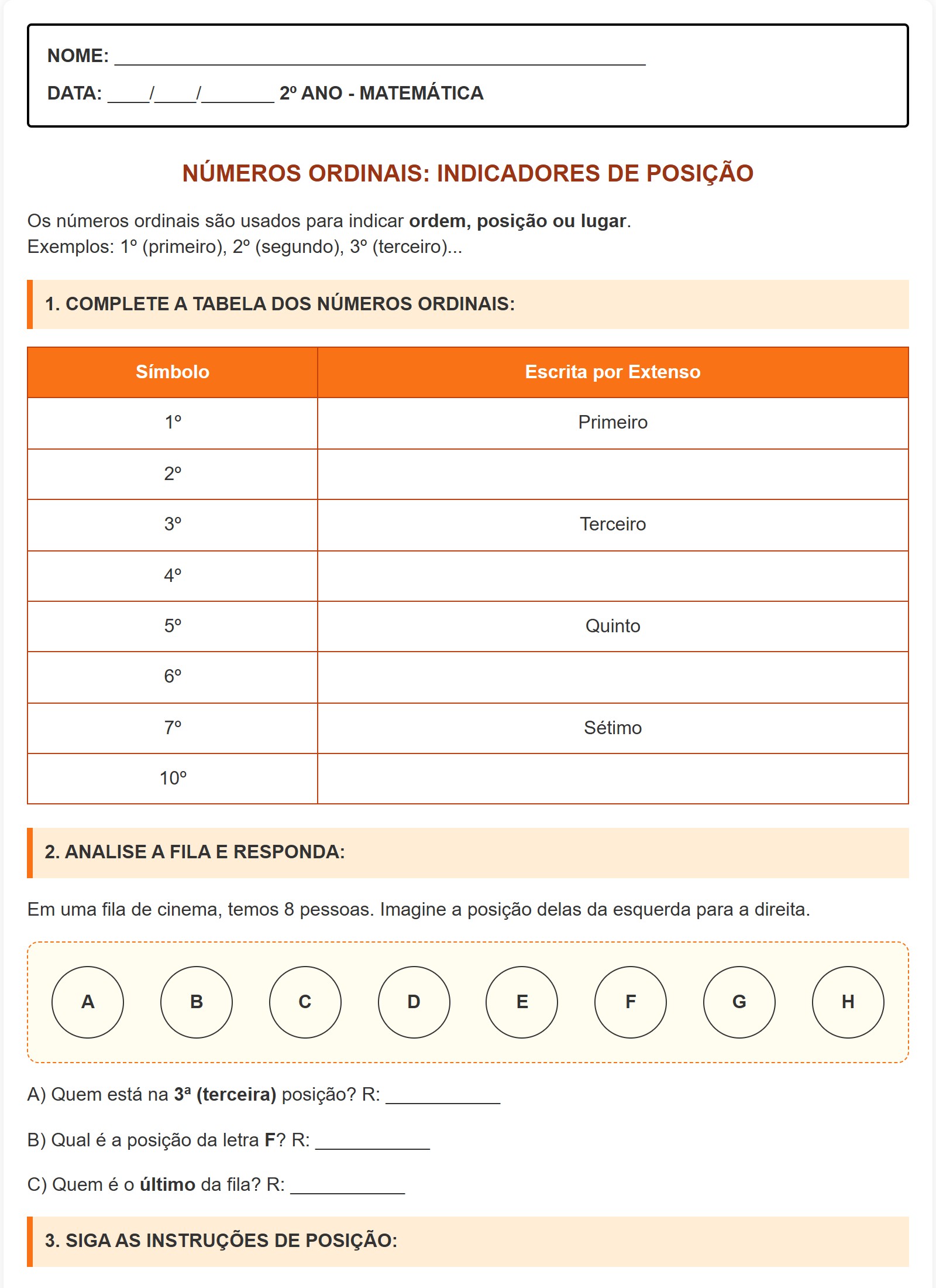 Os números ordinais são usados para indicar ordem, posição ou lugar.