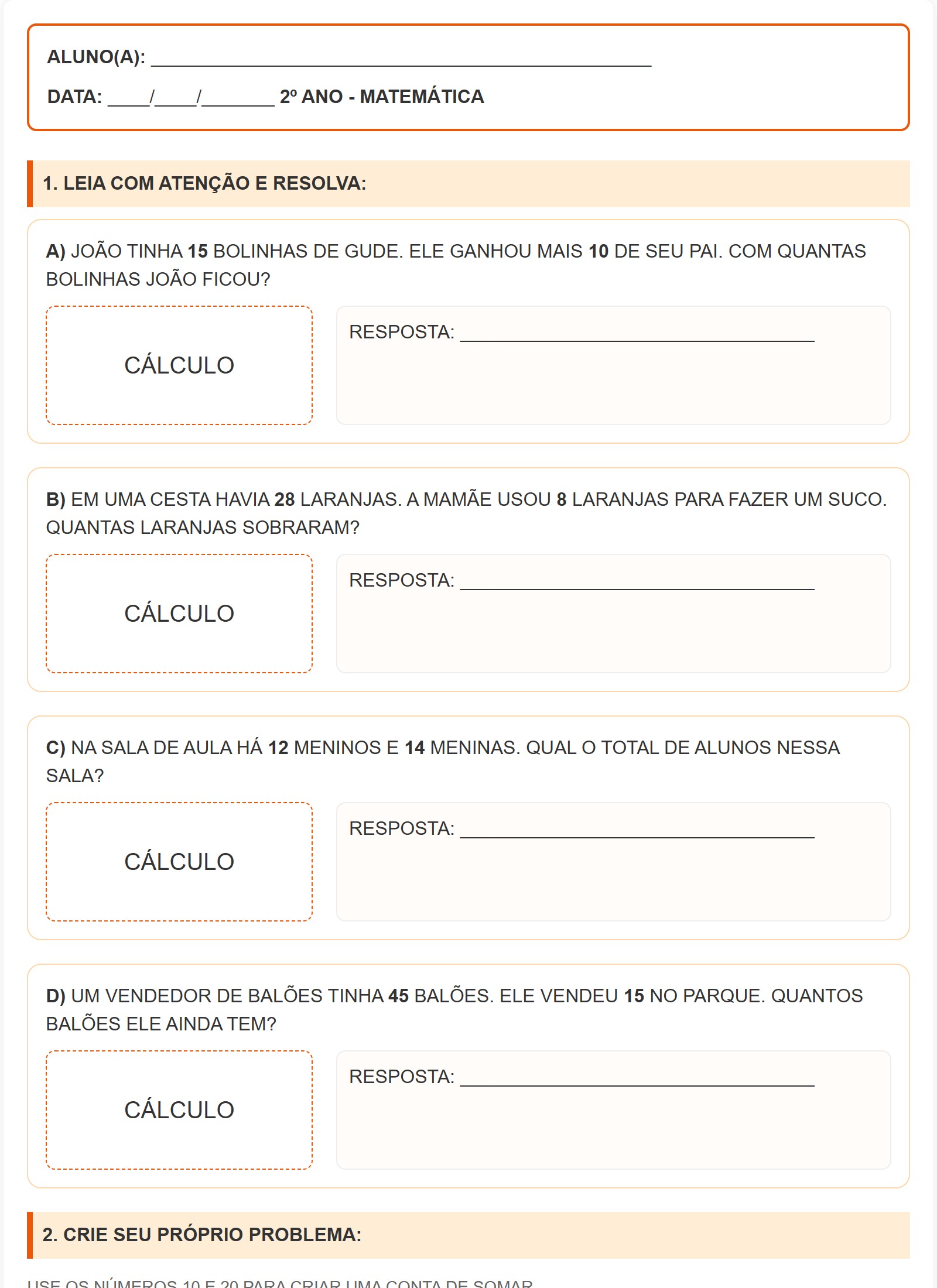 D) UM VENDEDOR DE BALÕES TINHA 45 BALÕES. ELE VENDEU 15 NO PARQUE. QUANTOS BALÕES ELE AINDA TEM?