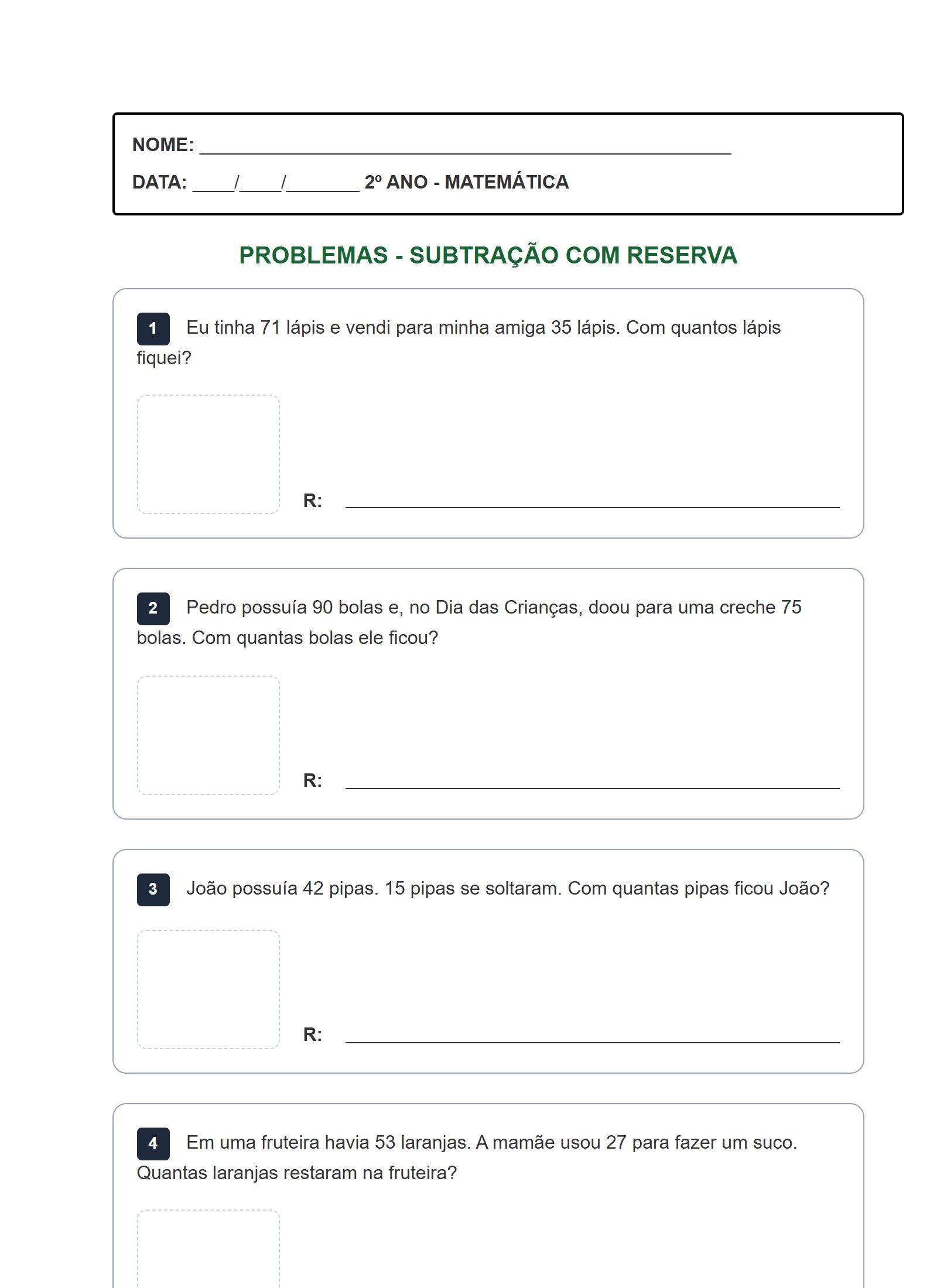 Problemas - Subtração com Reserva