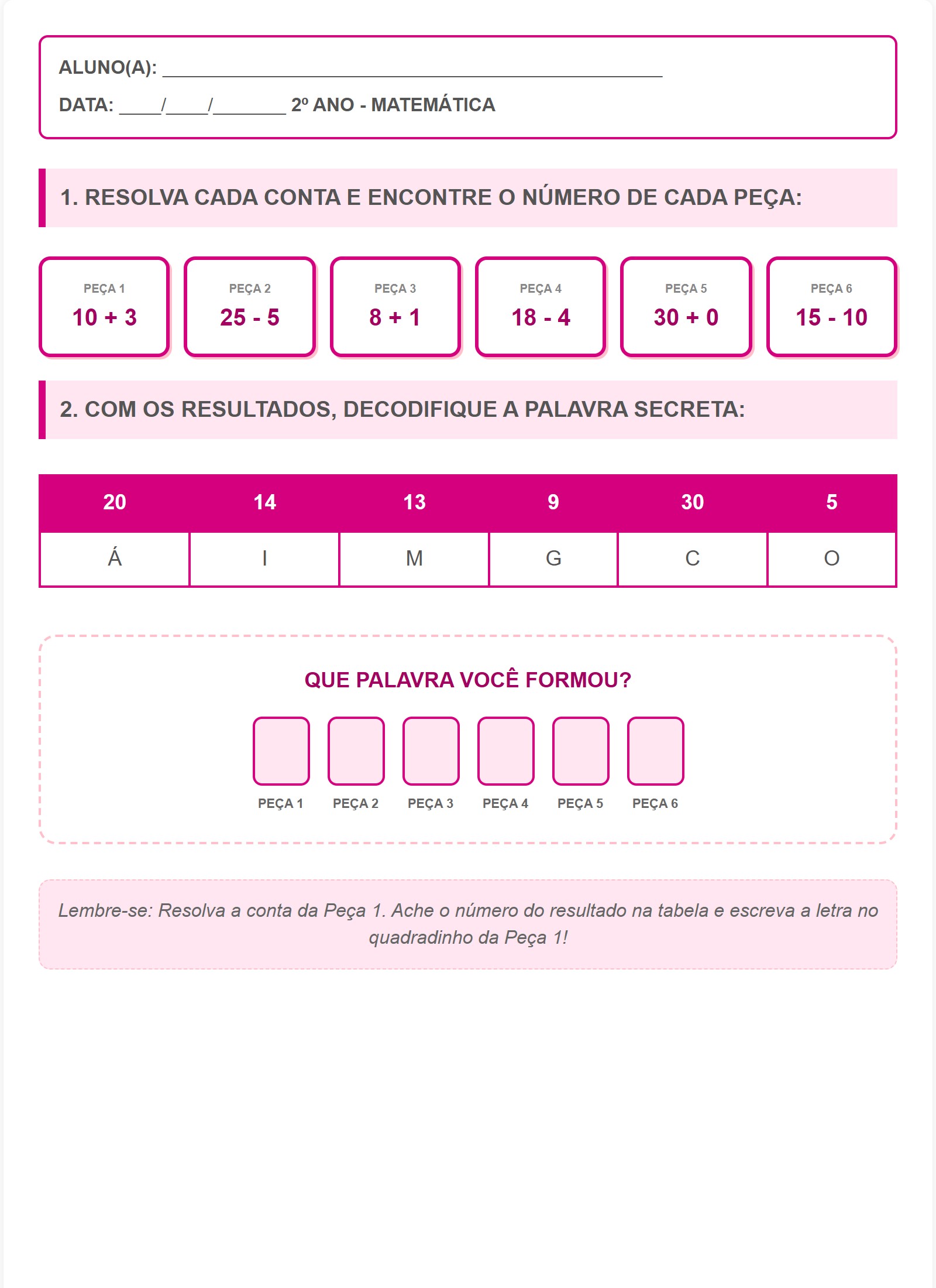 Lembre-se: Resolva a conta da Peça 1. Ache o número do resultado na tabela e escreva a letra no quadradinho da Peça 1!