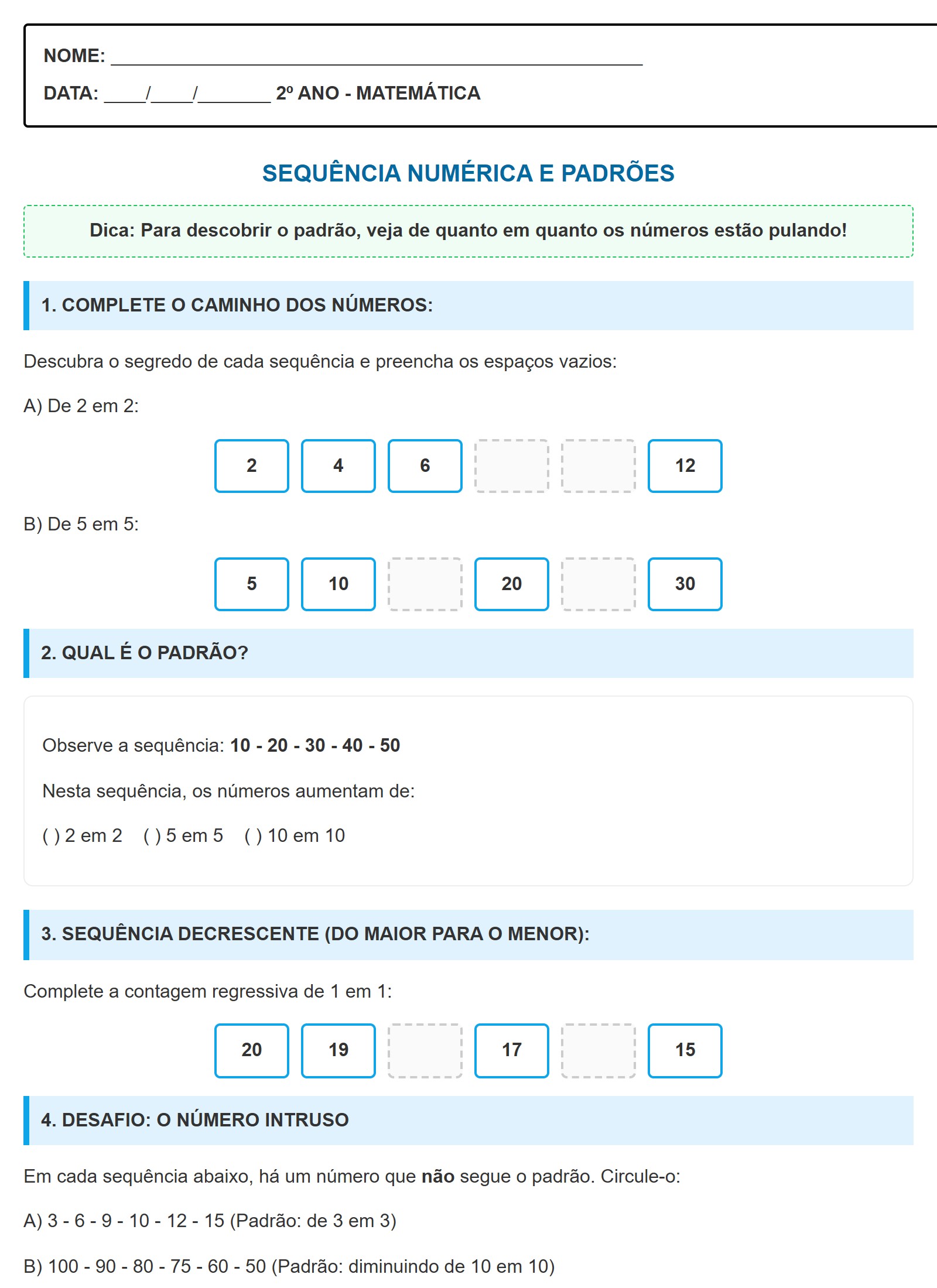 5. CRIE SUA PRÓPRIA SEQUÊNCIA:Escolha um padrão (ex: de 4 em 4) e comece pelo número 0: