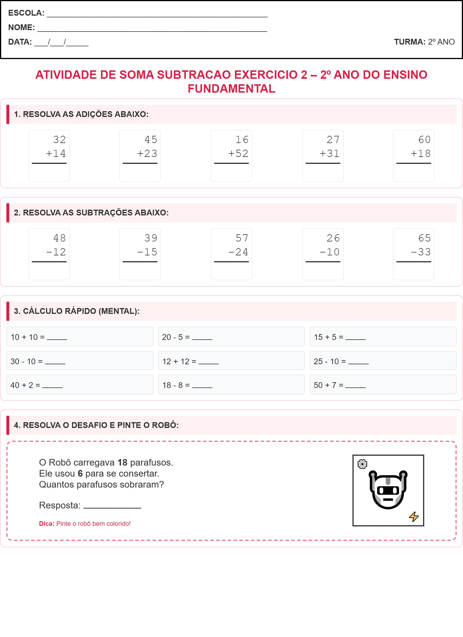 O Robô carregava 18 parafusos. Ele usou 6 para se consertar. Quantos parafusos sobraram?