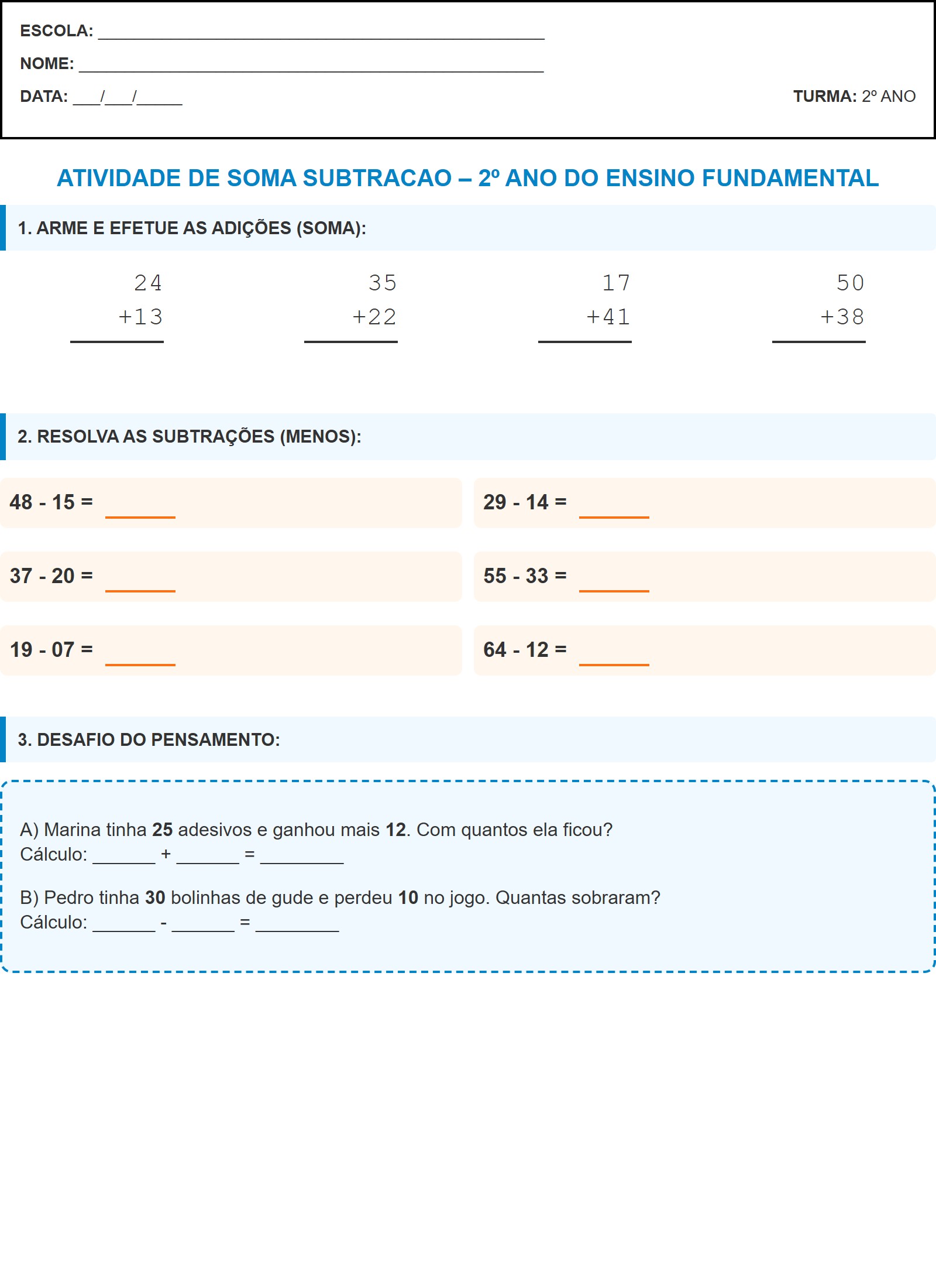 B) Pedro tinha 30 bolinhas de gude e perdeu 10 no jogo. Quantas sobraram? Cálculo: ______ - ______ = ________