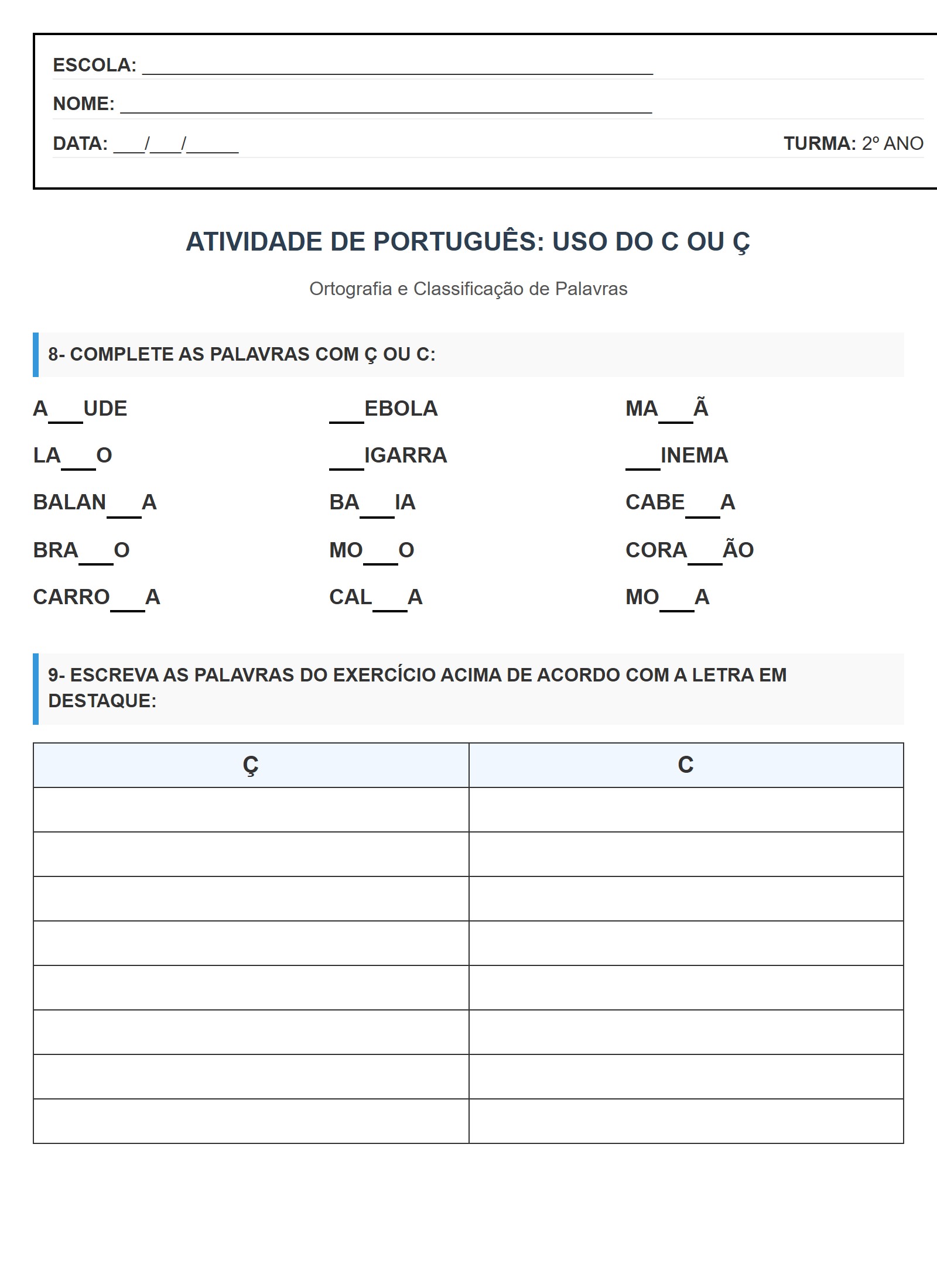 Atividade de Português: Uso do C ou Ç