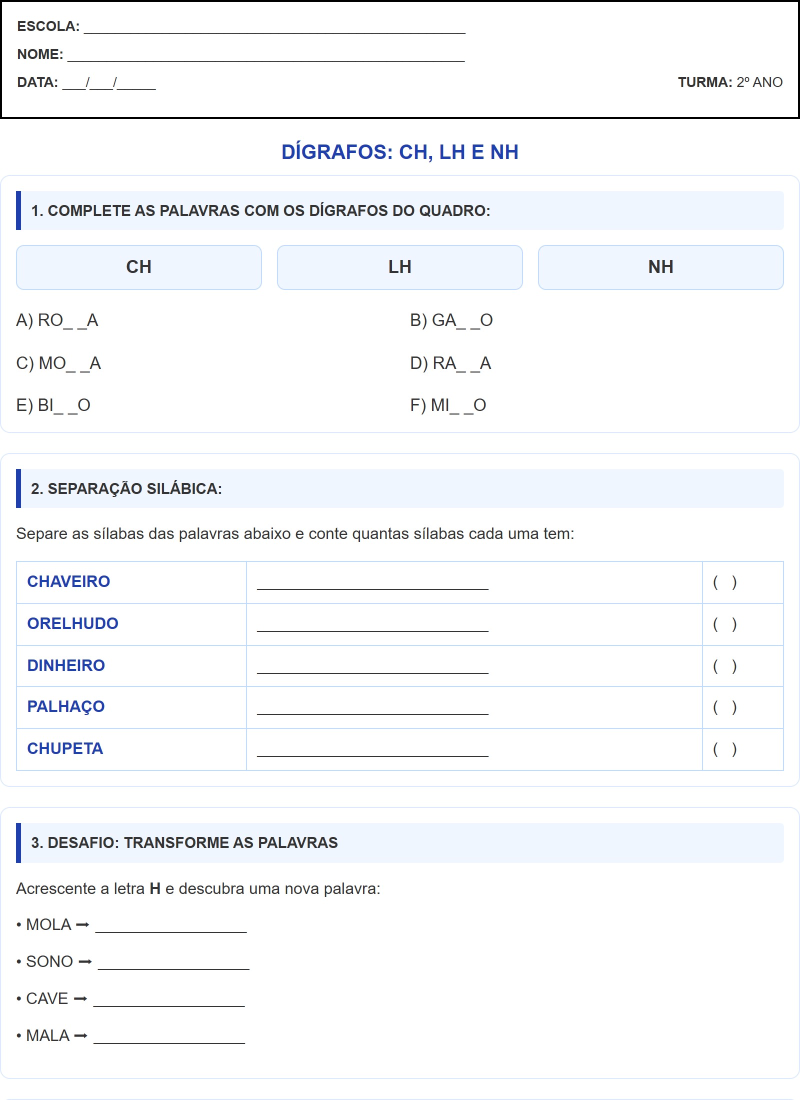 Separe as sílabas das palavras abaixo e conte quantas sílabas cada uma tem: