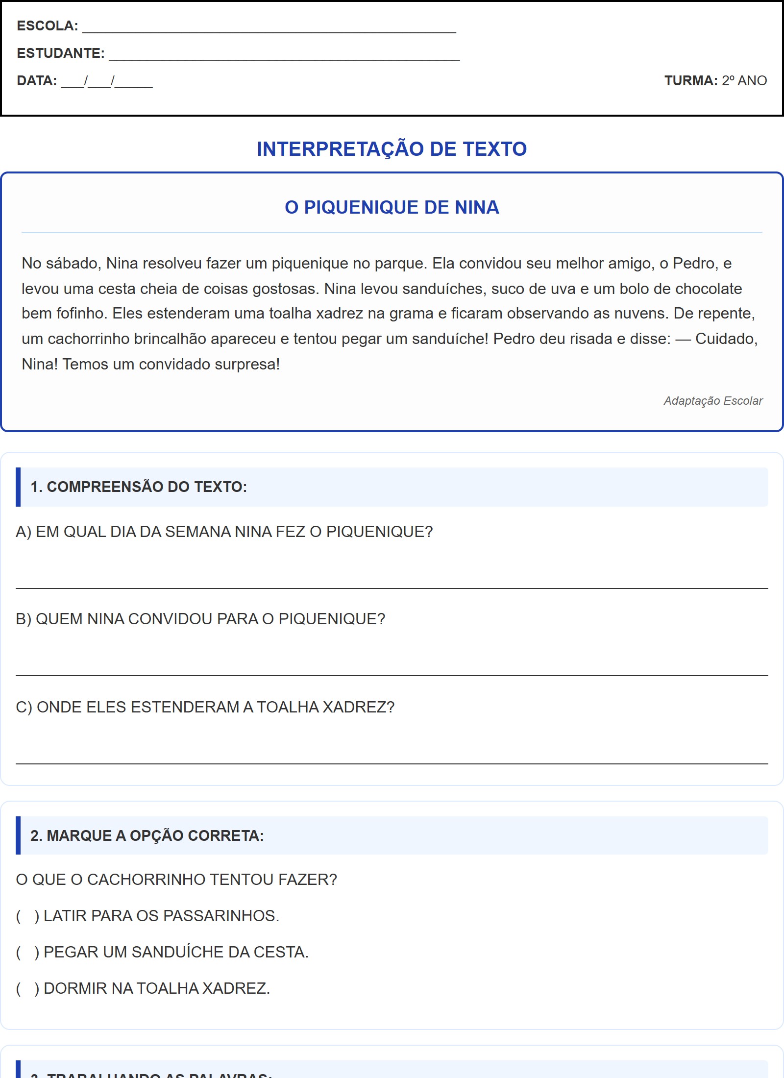 No sábado, Nina resolveu fazer um piquenique no parque. Ela convidou seu melhor amigo, o Pedro, e levou uma cesta cheia de coisas gostosas. Nina levou sanduíches, suco de uva e um bolo de chocolate bem fofinho. Eles estenderam uma toalha xadrez na grama e ficaram observando as nuvens. De repente, um cachorrinho brincalhão apareceu e tentou pegar um sanduíche! Pedro deu risada e disse: — Cuidado, Nina! Temos um convidado surpresa!