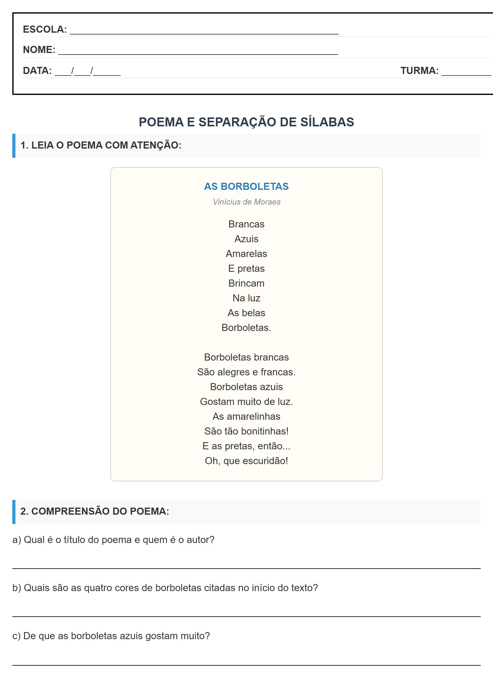 Separe as sílabas das palavras retiradas do poema e indique a quantidade de sílabas: