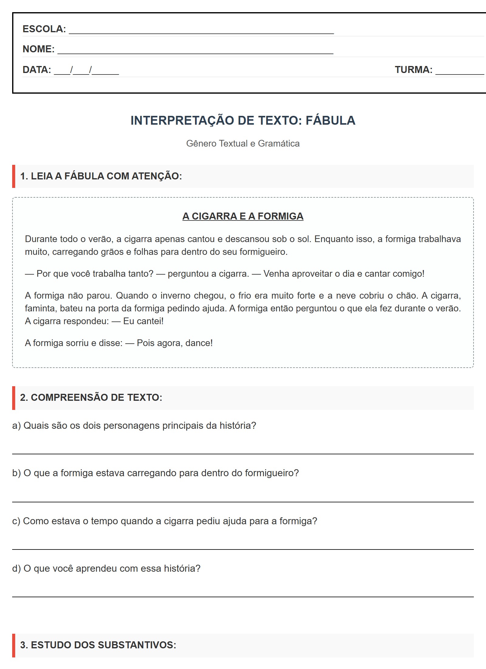 Substantivos são palavras que dão nome aos seres, objetos, lugares e sentimentos. Exemplo: Formiga, Verão, Grão.