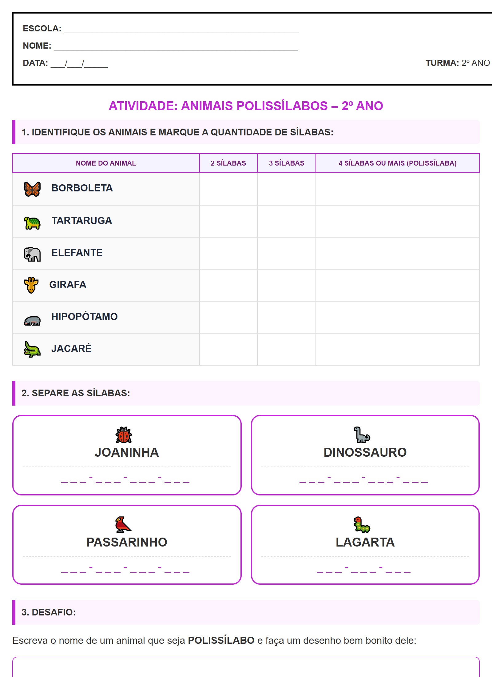 Escreva o nome de um animal que seja POLISSÍLABO e faça um desenho bem bonito dele: