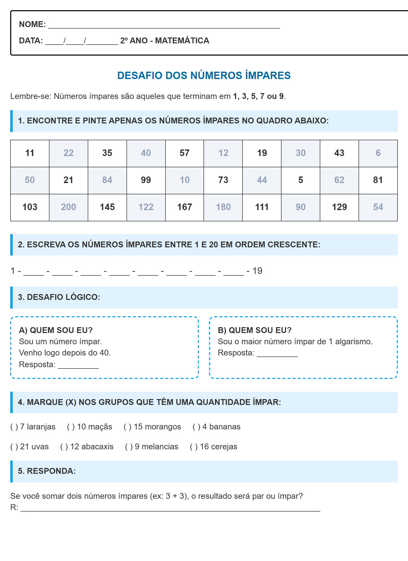 Trabalhar os números ímpares no 2º ano ajuda a criança a desenvolver o raciocínio lógico e a compreensão do sistema de numeração decimal. Nesta folha de atividades, exploramos a regra de terminação (1, 3, 5, 7 e 9) através de exercícios práticos de pintura, sequência numérica e desafios de lógica.